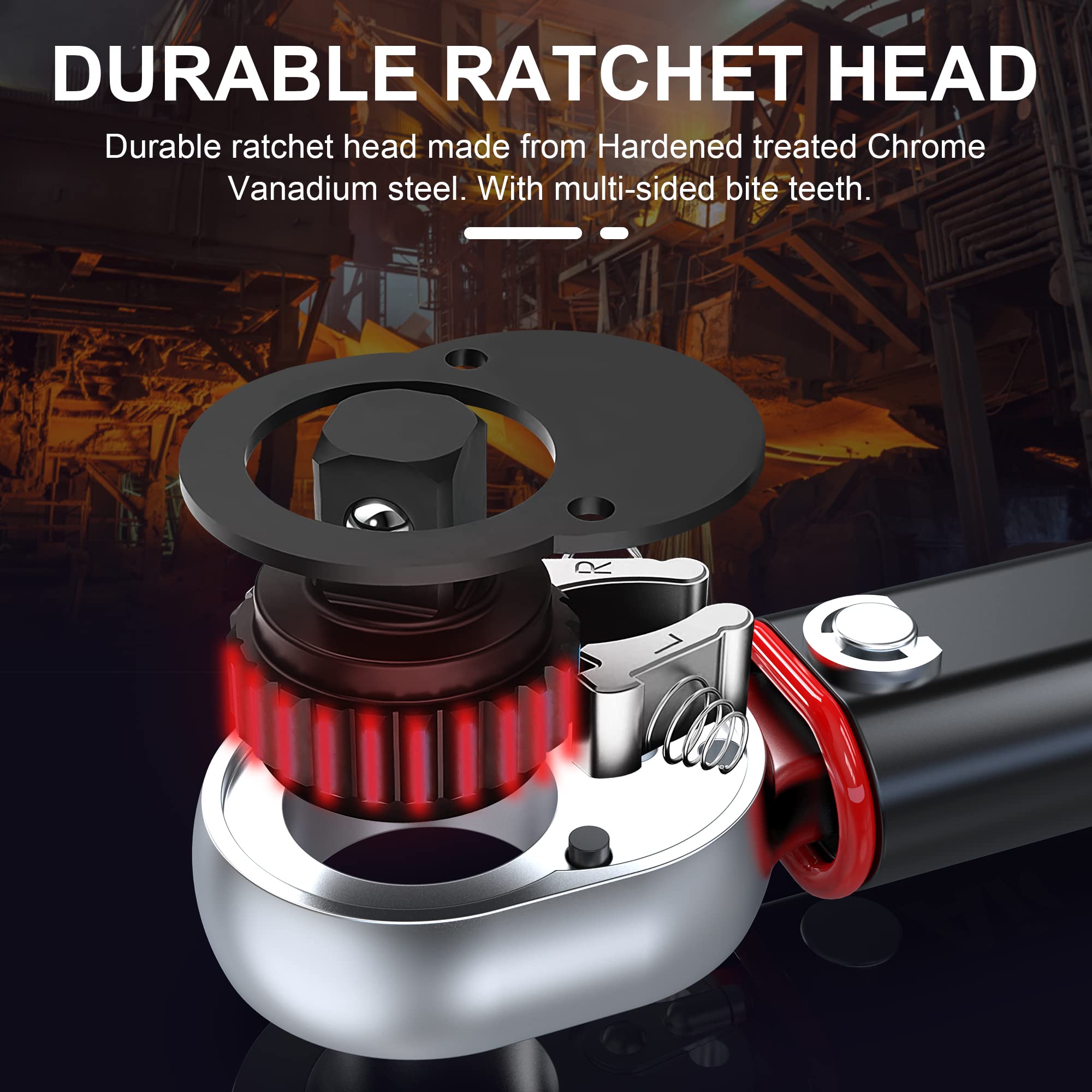 - Duradera cabeza de trinquete fabricada con aleación de acero al aleación de acero endurecido. Trinquete reversible con cabeza cuadrada y dispositivo de bloqueo de bola, palanca reversible precisa y segura.