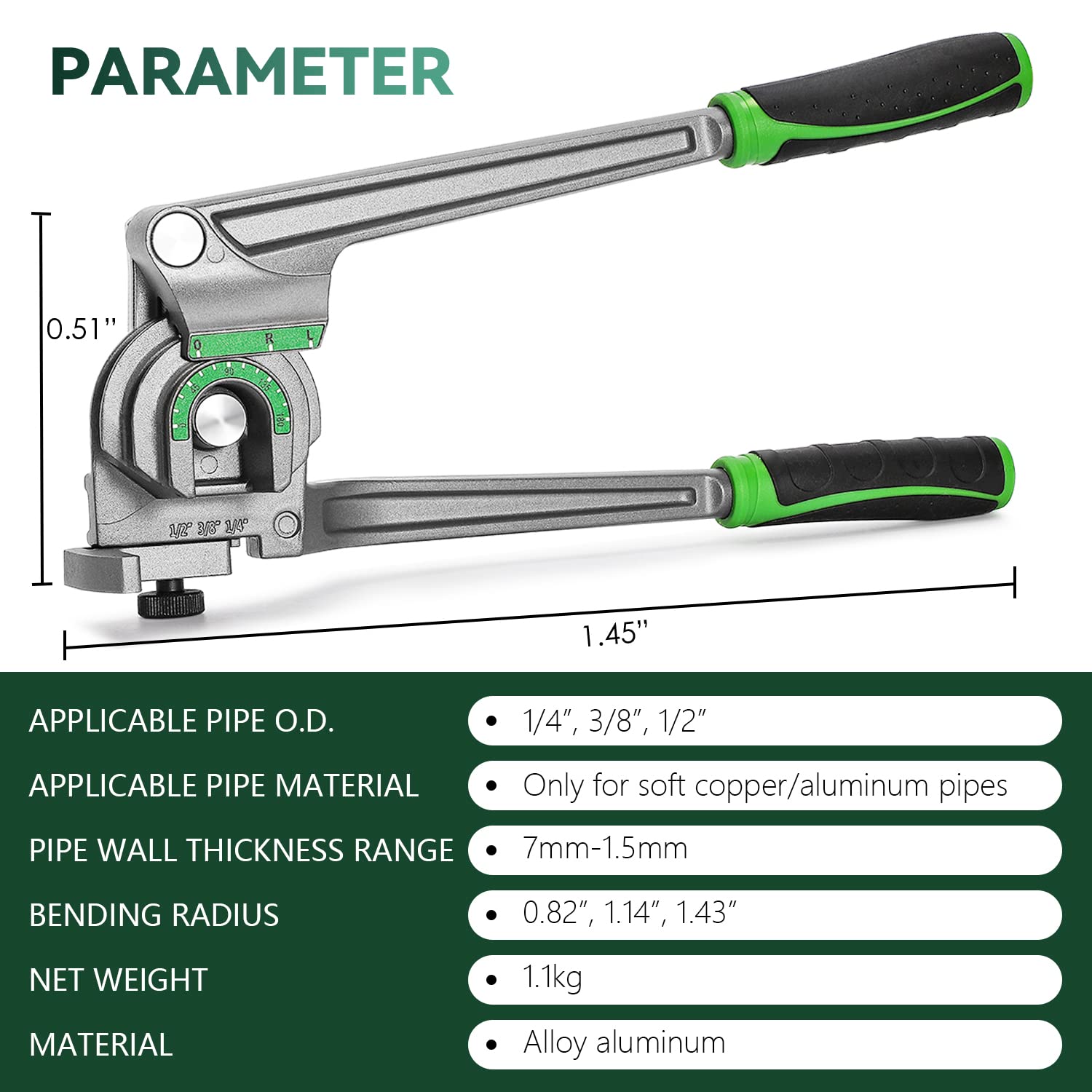 - [Parámetros] - Aplicación: solo para tuberías de cobre/aluminio; tubo aplicable OD: 1/4"、3/8"、1/2"; espesor de pared aplicable: 0.027”-0.059”(0.7mm-1.5mm); radio de curvatura: 0.82”, 1.14”, 1.43”(21mm, 29 mm, 36,5 mm); ángulo de flexión: 0~180°.