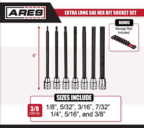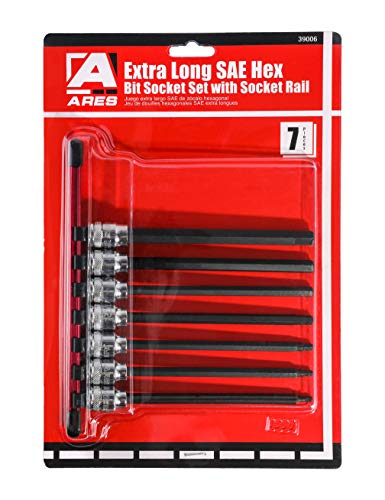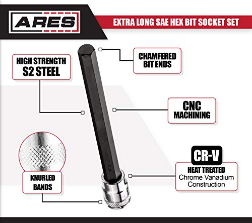 ARES Juego de herramientas mecánicas llaves hexagonales SAE extra largas - La broca S2 proporciona un mayor par de torsión - Práctico riel de almacenamiento incluido - Enchufes de acero al cromo vanadio tratado con calor