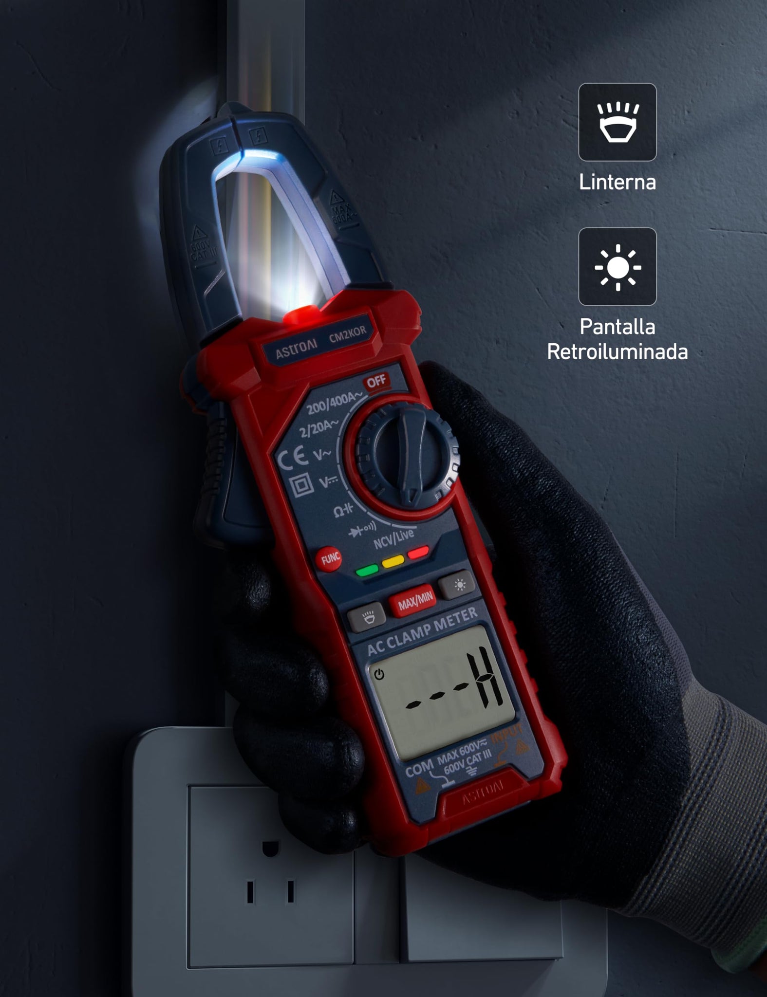 - FUNCIONES ADICIONALES: AstroAI Pinza Ampérimetrica CM2K0R de 2000 Cuentas con funciones que facilitan su uso, como el almacenamiento de datos, valores máximos/mínimos, apagado automático, indicador de batería baja, pitido de continuidad, alarma sonora y visual, pantalla LCD retroiluminada y linterna incorporada. Además, incluye dos baterías AAA de 1,5 V para que pueda utilizarlo inmediatamente después de recibirlo.