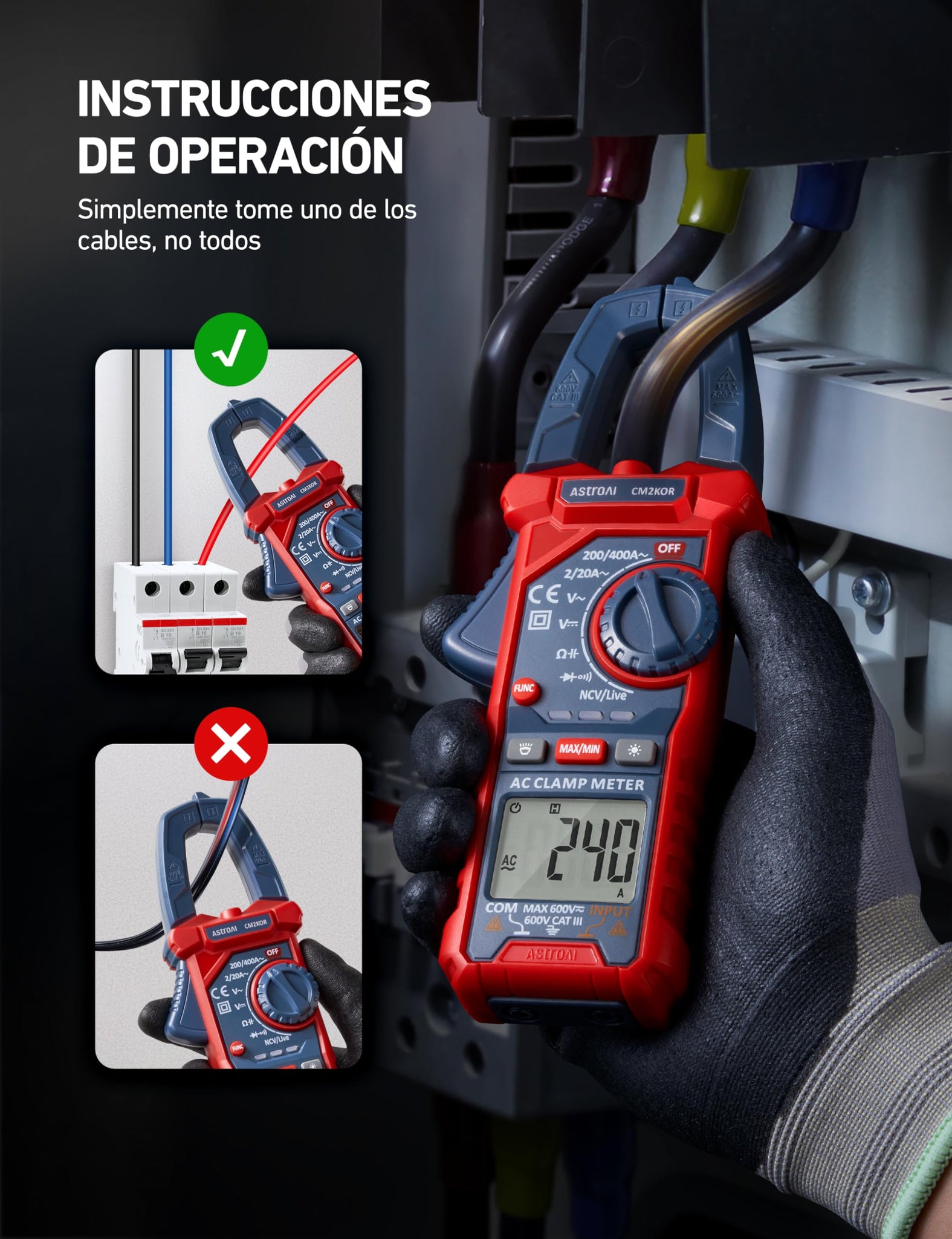 - MULTIFUNCIÓN & ALTA PRECISIÓN: AstroAI Pinza Ampérimetrica CM2K0R de 2000 Cuentas tiene la capacidad de medir con precisión la Corriente Alterna ( No se puede medir Corriente Continua), Voltaje CA/CC, capacitancia, resistencia, continuidad de diodo y fase de línea. Gracias a su diseño especial, este multímetro tiene una alta precisión de medición y puede ayudarlo a satisfacer diversas necesidades en la industria, el hogar, el bricolaje y etc.