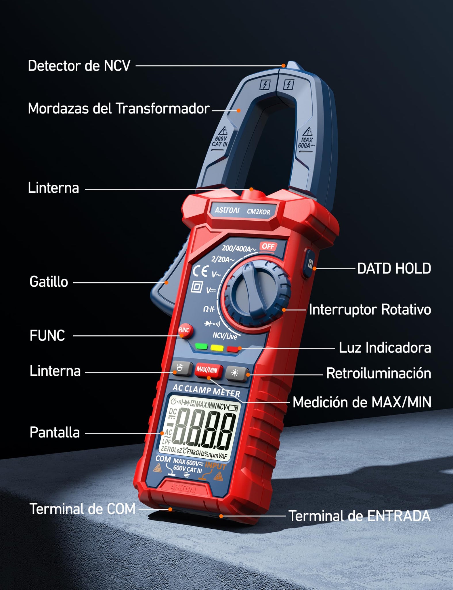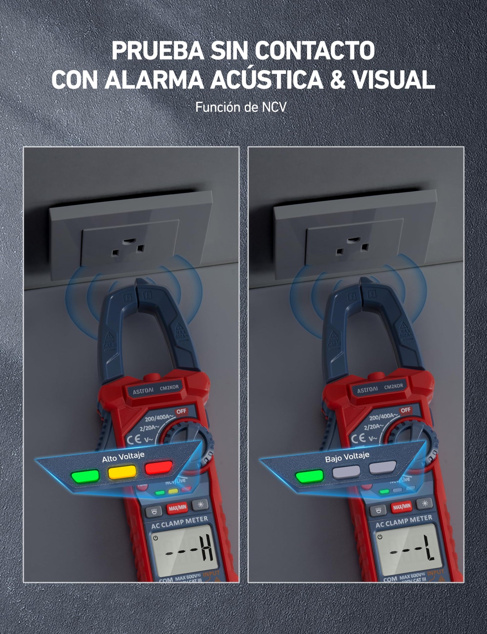 - SEGURIDAD INTEGRAL: AstroAI Pinza Ampérimetrica CM2K0R de 2000 Cuentas permite realizar pruebas sin contacto (NCV) y emite una alarma de luz y sonido. Este multímetro muestra señal de Corriente Alterna o Voltaje CA/CC débil con LED verde y pitido lento, lo que significa SEGURIDAD. Para señal fuerte, el LED es rojo y el pitido es rápido, lo que significa deber prestar ATENCIÓN A LA SEGURIDAD.