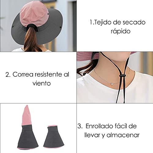 Sombreros de Sol para Mujeres, Mujer Agujero de Cola de Caballo Sombrero Cubo ala Ancha Algodón Sombreros Sol de Verano ala Ancha Protección Solar UV Gorra Ajustable Pesca en la Playa Sombrero