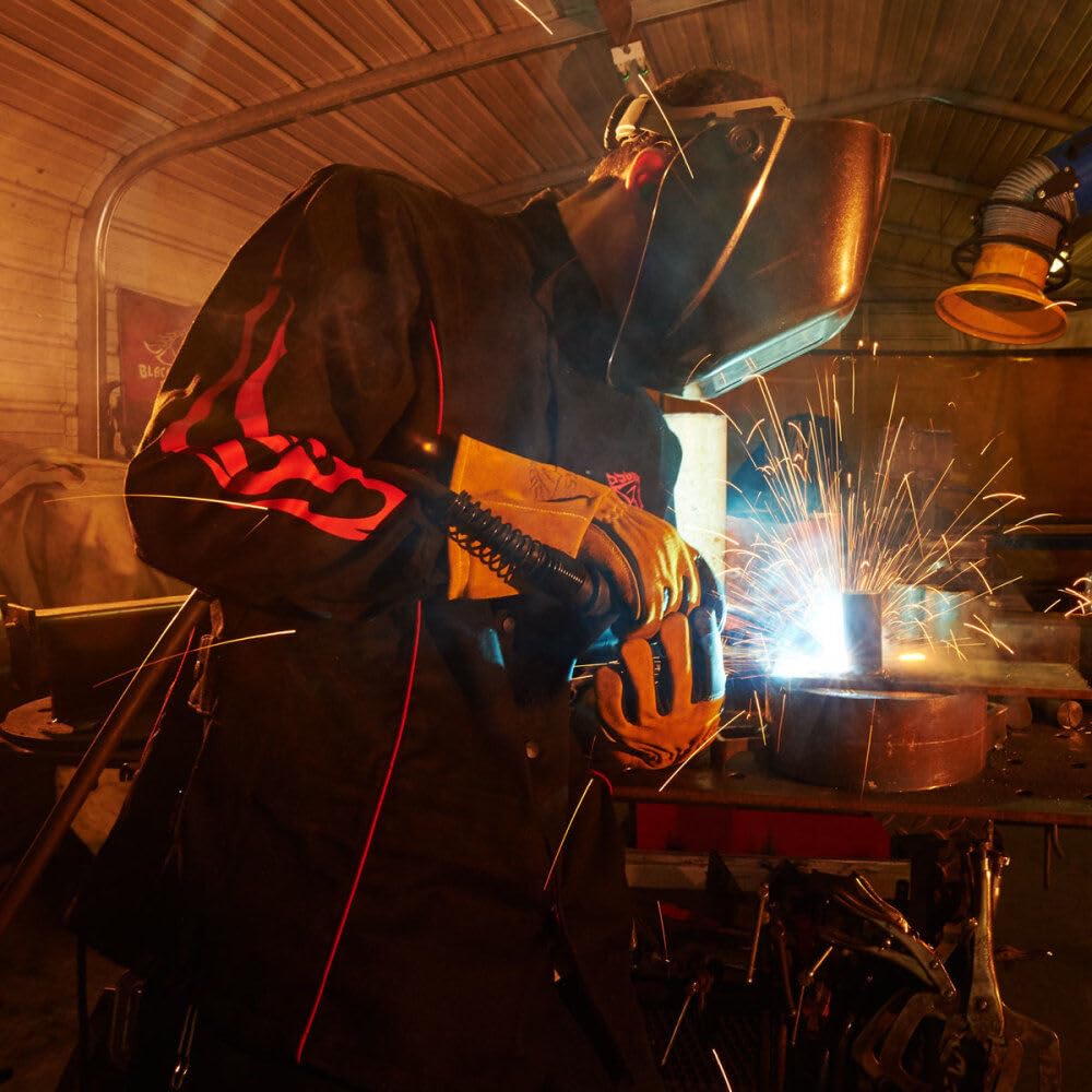 ▶ Chamarra de soldadura de algodón con llamas rojas, talla XL