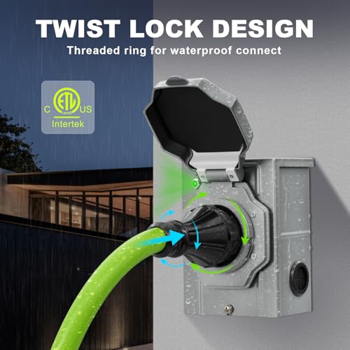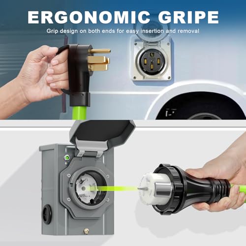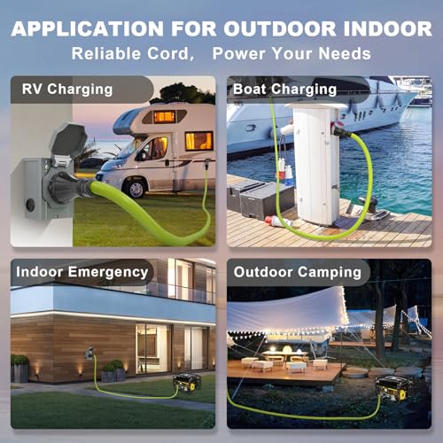 - Diseño ergonómico: el cable de alimentación del generador de 50 amperios cuenta con un mango de agarre fácil de usar, y el extremo hembra está equipado con un conector de bloqueo giratorio para una conexión segura, al polvo y al agua. Su color verde brillante lo hace claramente visible en áreas con poca luz. Hay una variedad de longitudes de cable disponibles, lo que permite que el generador se coloque de forma segura lejos de la casa.