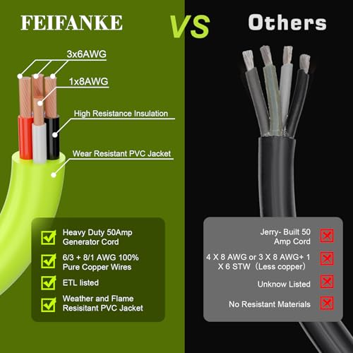 - Listado ETL para seguridad: tu seguridad es nuestra máxima prioridad. El cable de alimentación del generador FEIFANKE de 50 amperios está certificado ETL. Nuestro cable de extensión estándar de alta calidad está hecho de alambre de cobre puro y PVC ignífugo, resistente al calor, resistente a los rayos UV. Puede soportar la lluvia, el viento, la nieve, el piso y las rocas. Puedes confiar en su rendimiento fiable, ya sea lluvioso, nevado o inclemencias del tiempo.