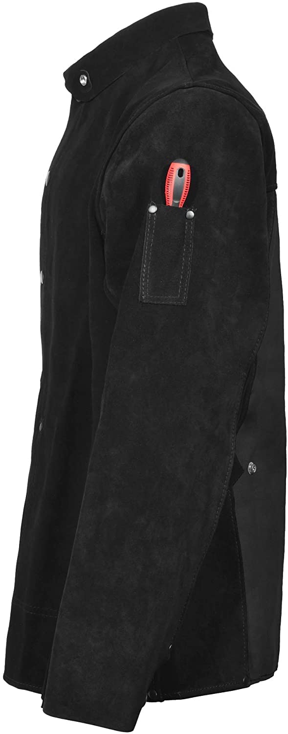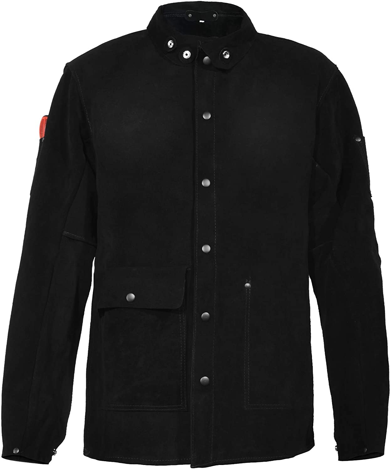 ▶ Chaqueta de soldadura de cuero negro, chaquetas de seguridad de trabajo de cuero vacuno dividido FR, chaquetas soldadoras para hombres y mujeres, Negro, XX-Large