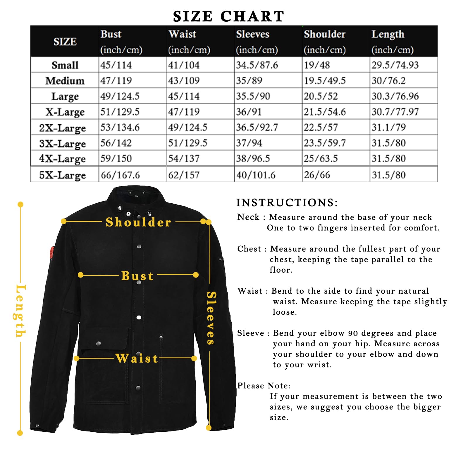 - Cuero ignífugo de alta calidad: la chaqueta está hecha de cuero vacuno grueso dividido. Las fundas de cuero resistentes desde el cuello hasta la cintura proporcionan una gran cobertura y protección contra llamas y salpicaduras. 100% cuero es más duradero y más fuerte que la tela