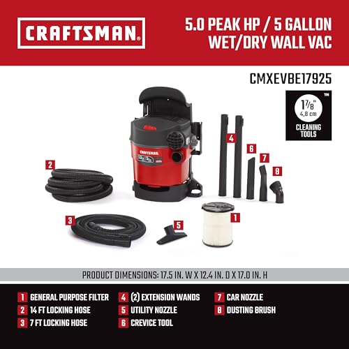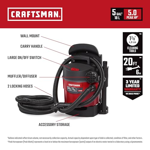 Detalles: Libera la potencia de un lavado de autos en tu propio cochera con el sistema de limpieza montado en la pared CRAFTSMAN de 5 galones y 5.0 picos. Esta aspiradora húmeda y seca se monta en la pared y libera valioso espacio en el cochera. La aspiradora se puede quitar fácilmente de la pared y llevar a otros lugares incluso en toda la casa, por lo que es una valiosa herramienta doméstica. Monta esta aspiradora en la pared de tu cochera y utiliza la manguera extralarga de 20 pies para limpiar tu coche o tu espacio de trabajo. La manguera almacena a bordo y el almacenamiento de accesorios mantiene los accesorios incluidos a mano para un acceso rápido. * Los galones indicados reflejan el volumen del tambor, no necesariamente la capacidad de recogida, la capacidad real depende del tipo de desechos recogidos, el estado del filtro y otros factores. La potencia máxima representa un nivel en o por debajo de la salida máxima de potencia de un motor eléctrico probado en un laboratorio utilizando un dinamómetro.