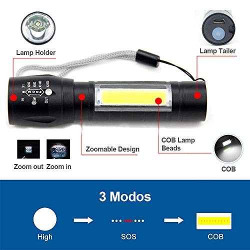 - 🔦ALTO RENDIMIENTO: Linterna LED con led de XML-T6 + COB tiene un diseño compacto para ofrecer 5 modos de luz,ilumina fácilmente el lugar o concéntrate en objetos