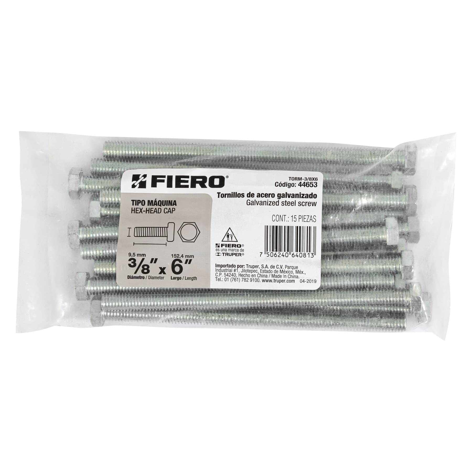 🔩 Fiero TORM-3/8X6, Tornillo tipo máquina, 3/8 x 6", bolsa con 15 pzas