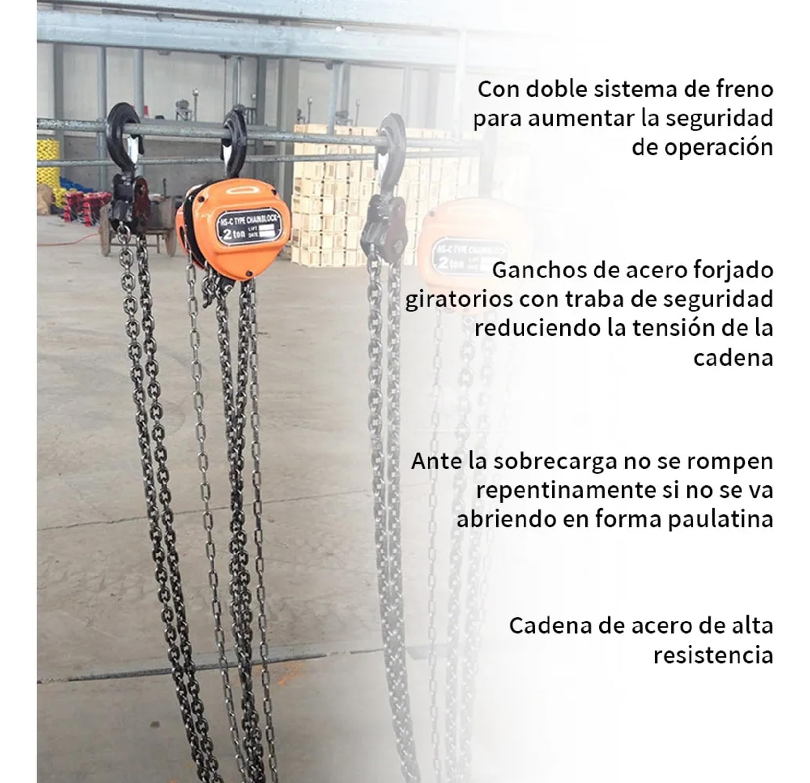 - 【Alta Capacidad de Elevación】Capaz de levantar hasta 2 toneladas con su robusta cadena G80 de 6 mm de grosor y sistema de piñón, perfecto para manipular cargas pesadas sin esfuerzo.