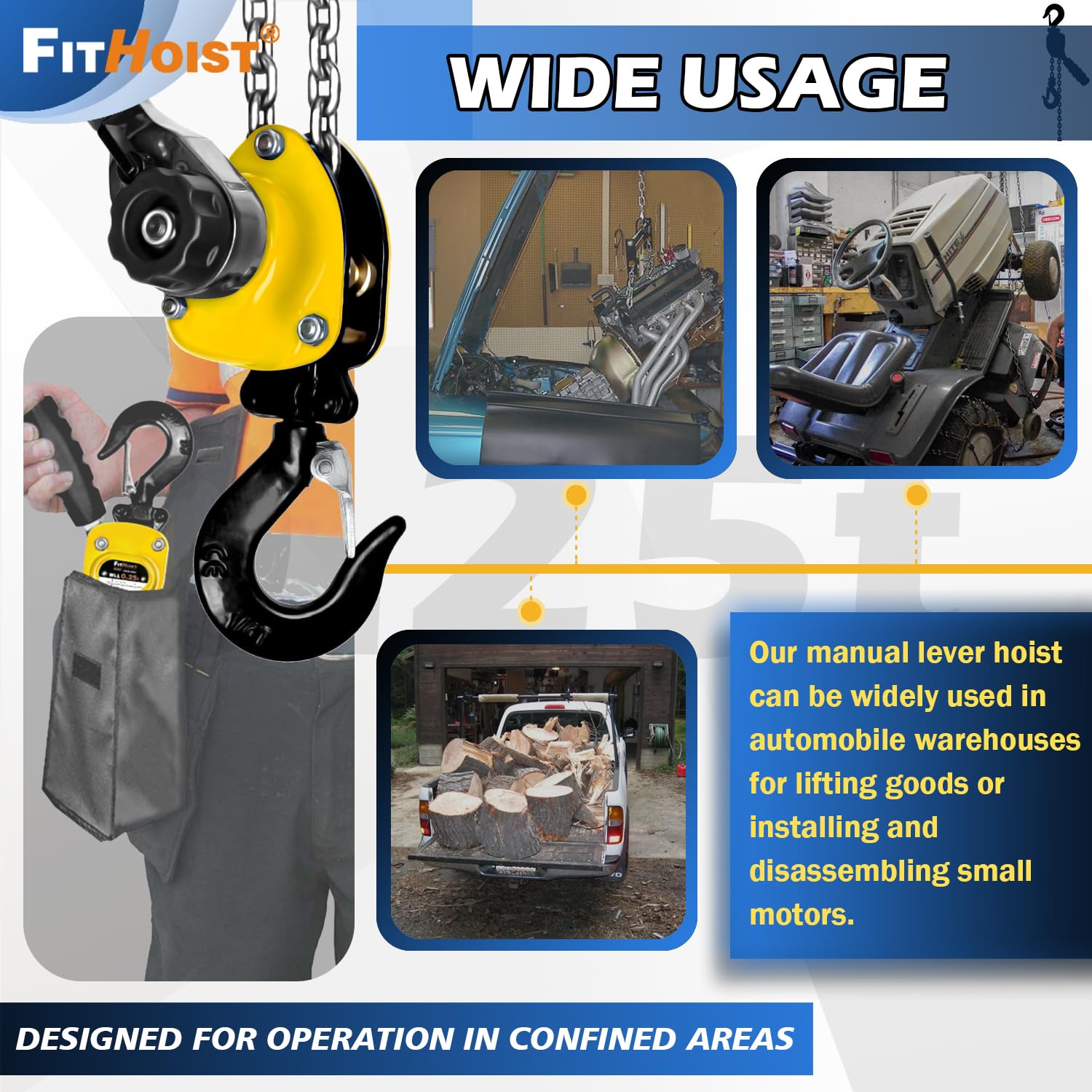 - Fácil de transportar y almacenar: con su estructura compacta y bolsa de almacenamiento incluida, este mini polipasto de cadena es fácil de transportar y almacenar. Es perfecto para levantar a corta distancia de equipos pequeños y maquinaria en garajes, almacenes y talleres automotrices.