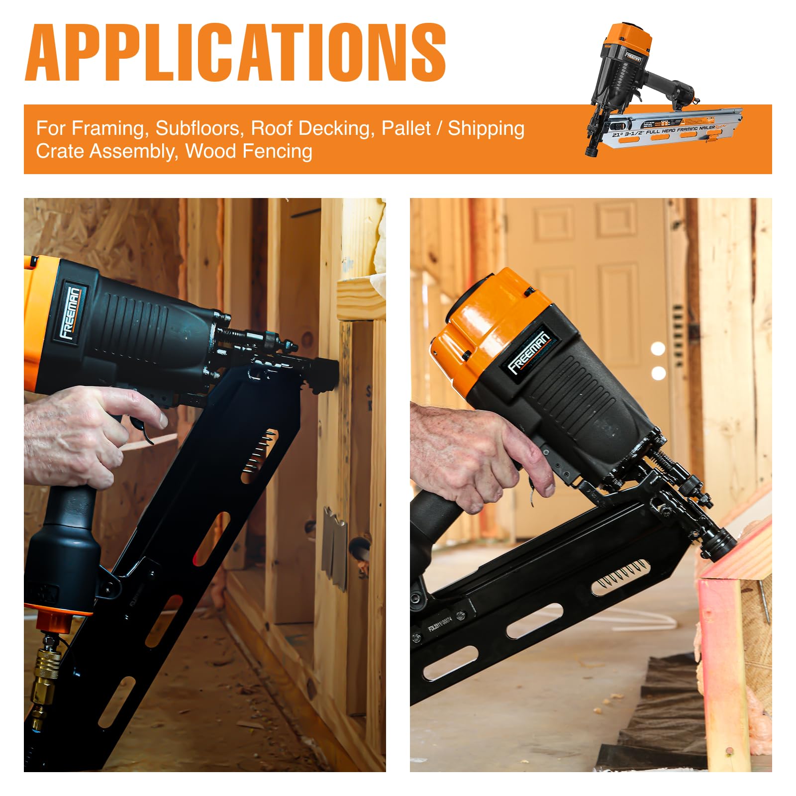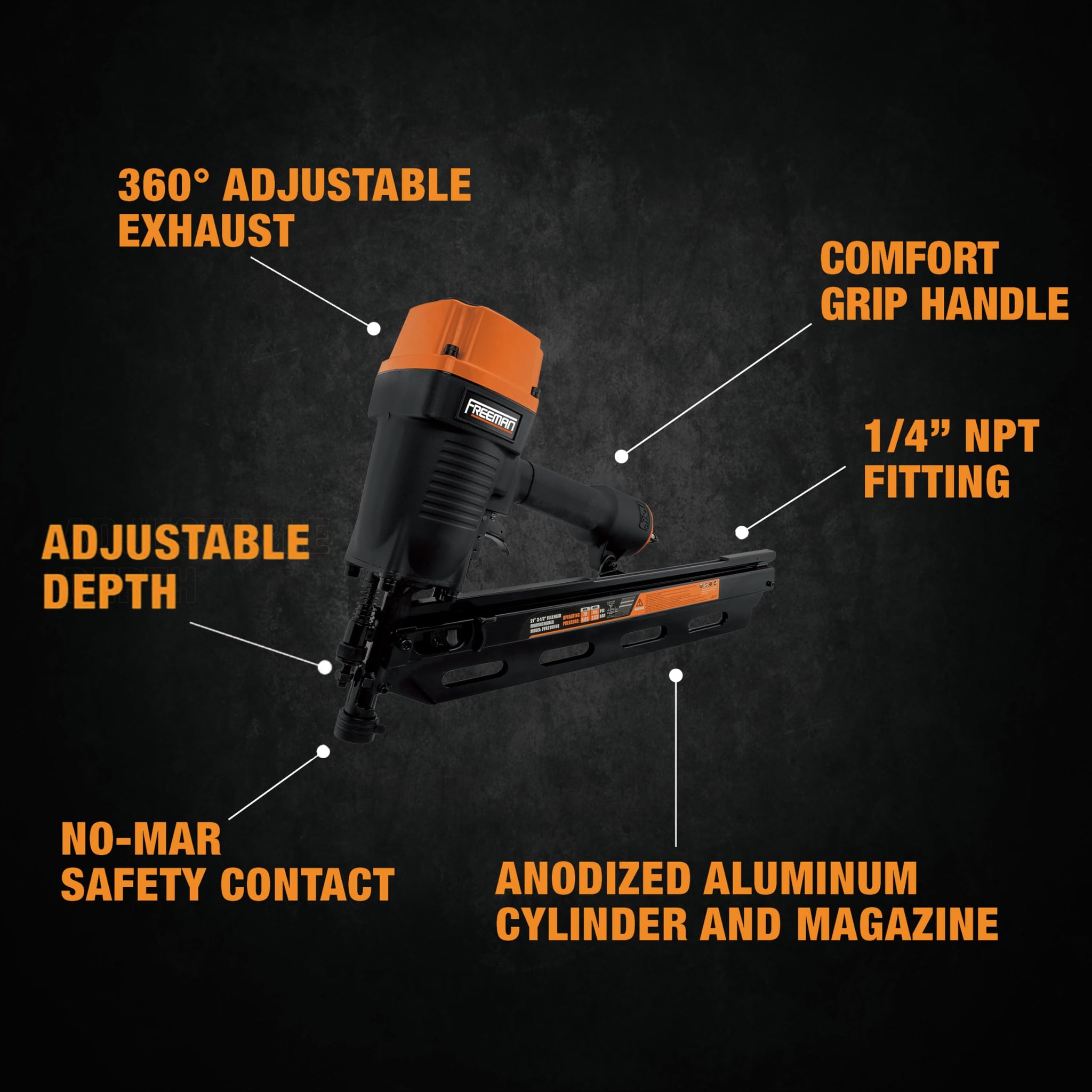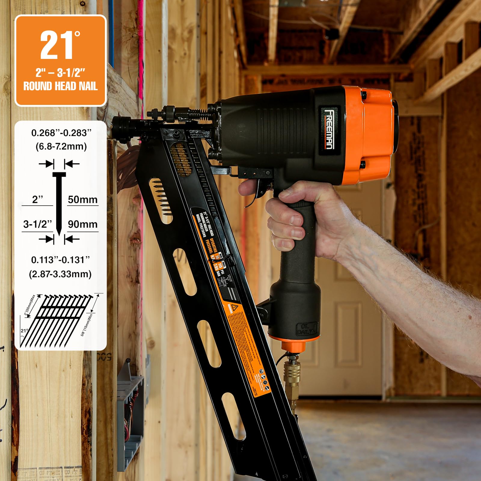 Clavadora neumática de 21 grados con clavos | Clavos de cabeza redonda completa de 2 pulgadas - 3-1/2 pulgadas | Anti-fuego seco, doble gatillo, ajuste de profundidad y agarre Freeman