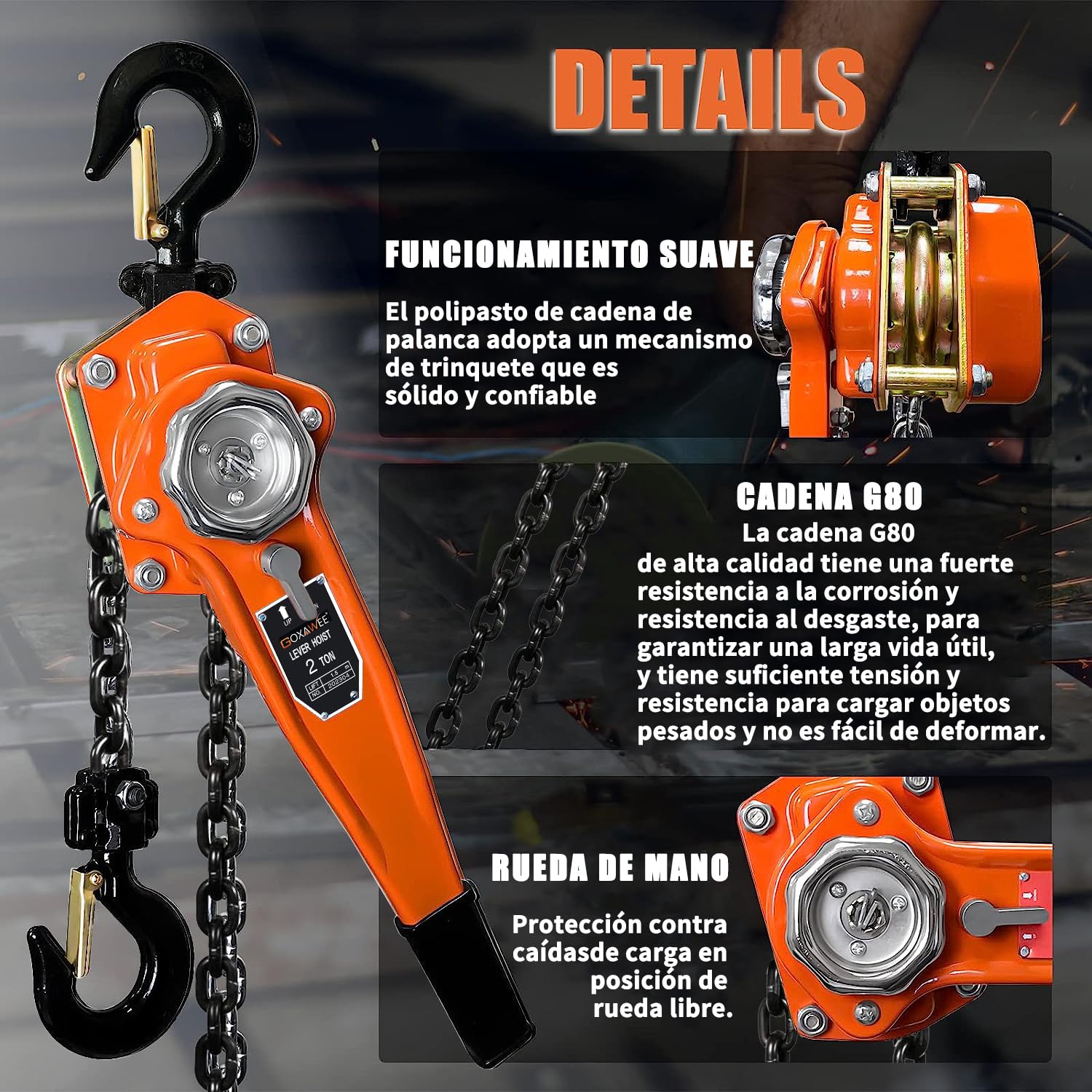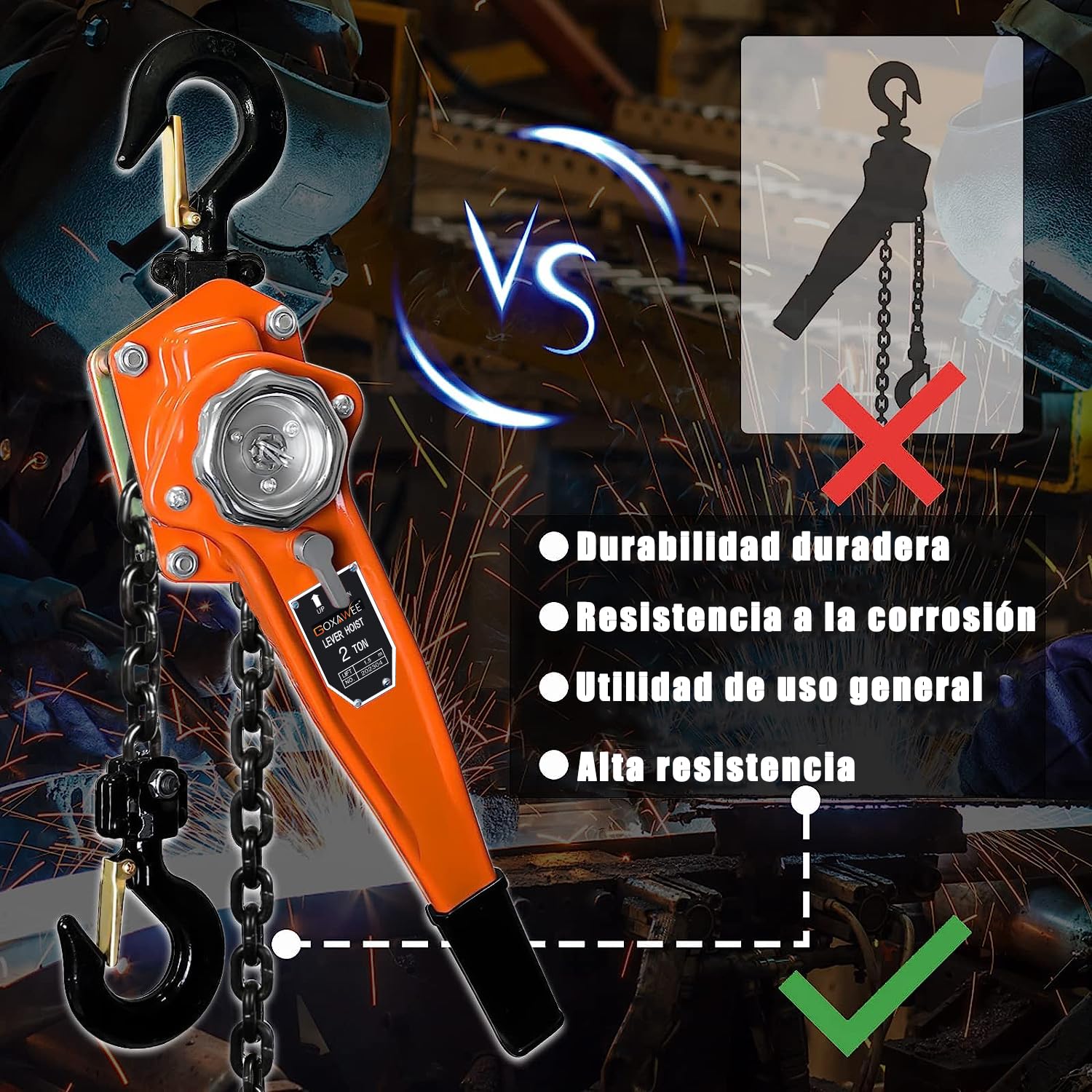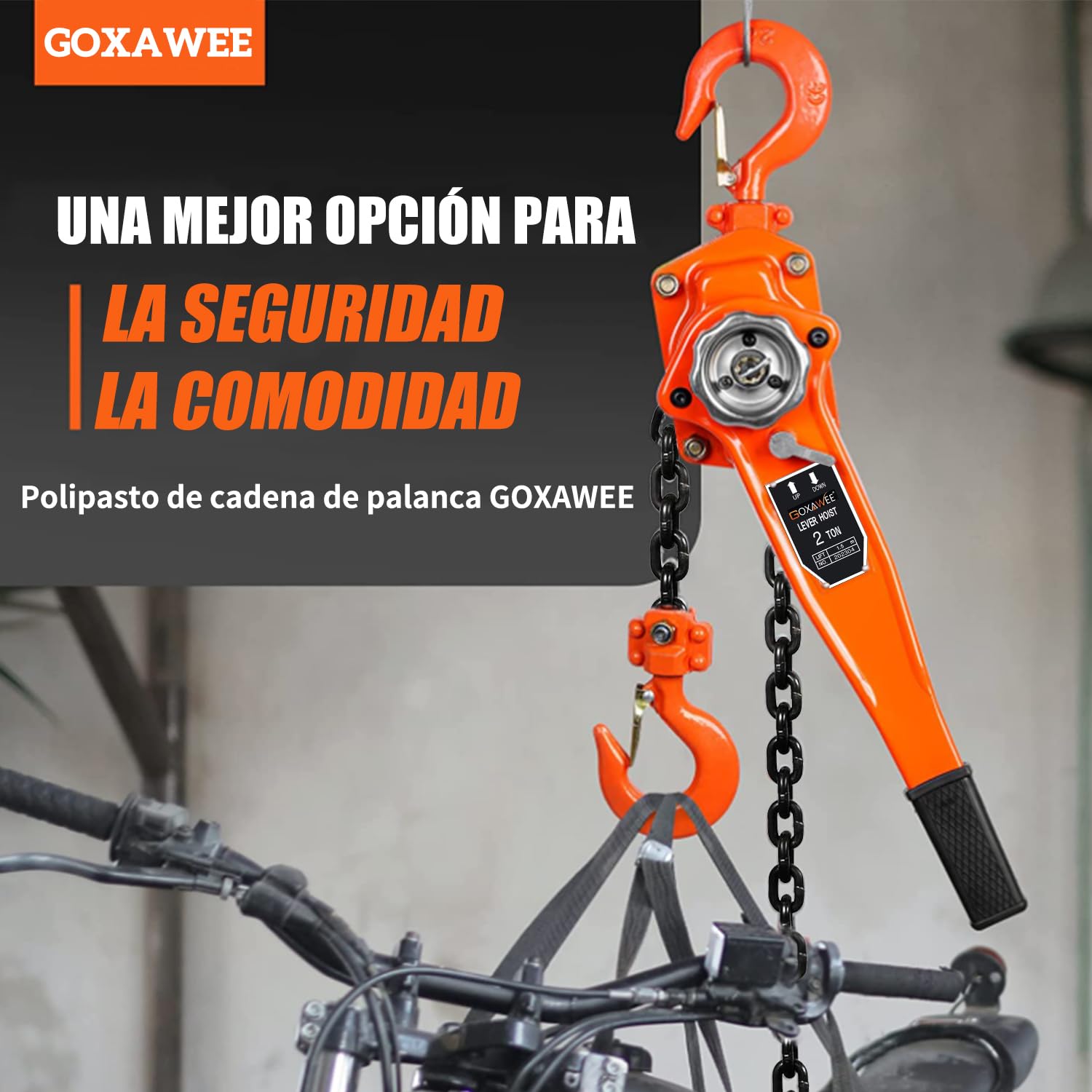 - 2000KG POTENCIA INDUSTRIAL :GOXAWEE Polipasto manual de 4410 lb fabricado en acero al carbono reforzado, diseñado para entornos mixtos donde coexistan polipastos manuales y eléctricos. Ideal como solución secundaria junto a polipasto electrico 500kg o polipasto electrico 1000kg, garantizando versatilidad en talleres y almacenes con equipos diversificados.
