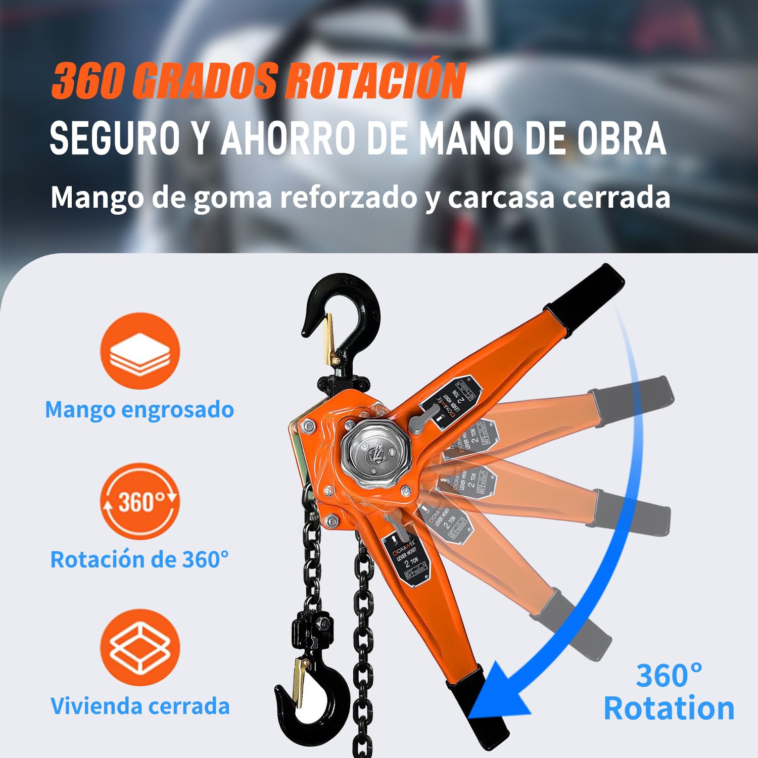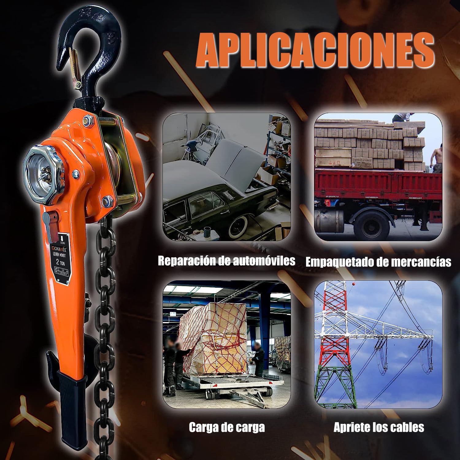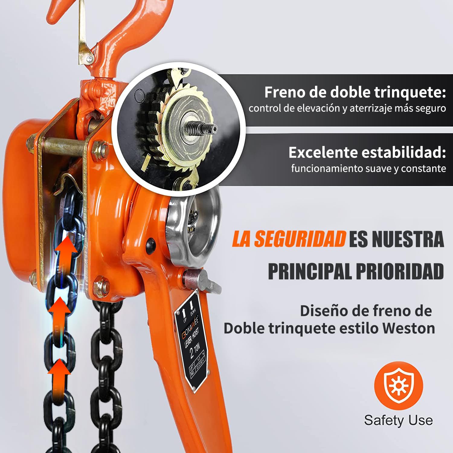 - 2000KG POTENCIA INDUSTRIAL :GOXAWEE Polipasto manual de 4410 lb fabricado en acero al carbono reforzado, diseñado para entornos mixtos donde coexistan polipastos manuales y eléctricos. Ideal como solución secundaria junto a polipasto electrico 500kg o polipasto electrico 1000kg, garantizando versatilidad en talleres y almacenes con equipos diversificados.