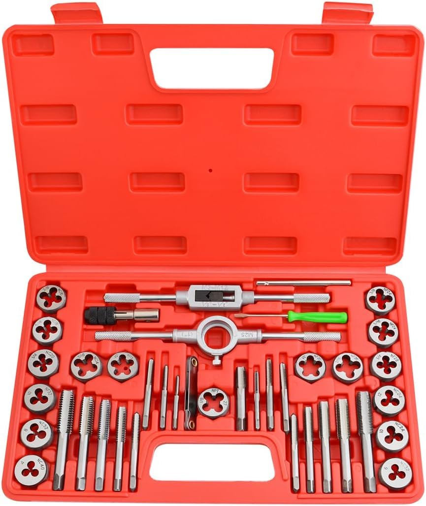 - 【Juego Completo Para Roscar】Este 40 piezas juego manualidades Tarrajas y Machuelos para roscar incluye 16 tamaños SAE mismos para los grifos y los cojinetes : 4-40 NC, 6-32 NC, 8-32 NC, 10-24 NC, 12-24 NC, 1/4-20 NC, 5/16-18 NC, 3/8-16 NC, 7/16-14 NC, 1/2-13 NC, 10-32 NF, 1/4-28 NF, 5/16-24 NF, 3/8-24 NF, 7/16-20 NF, 1/2-20 NF; 1x Llave para machos (1/16”-1/2”); 1 x Portamachos en T; 1x Porta cojinetes (1/16”-1/2”); 1x Destornillador; 1x Calibres para roscas.