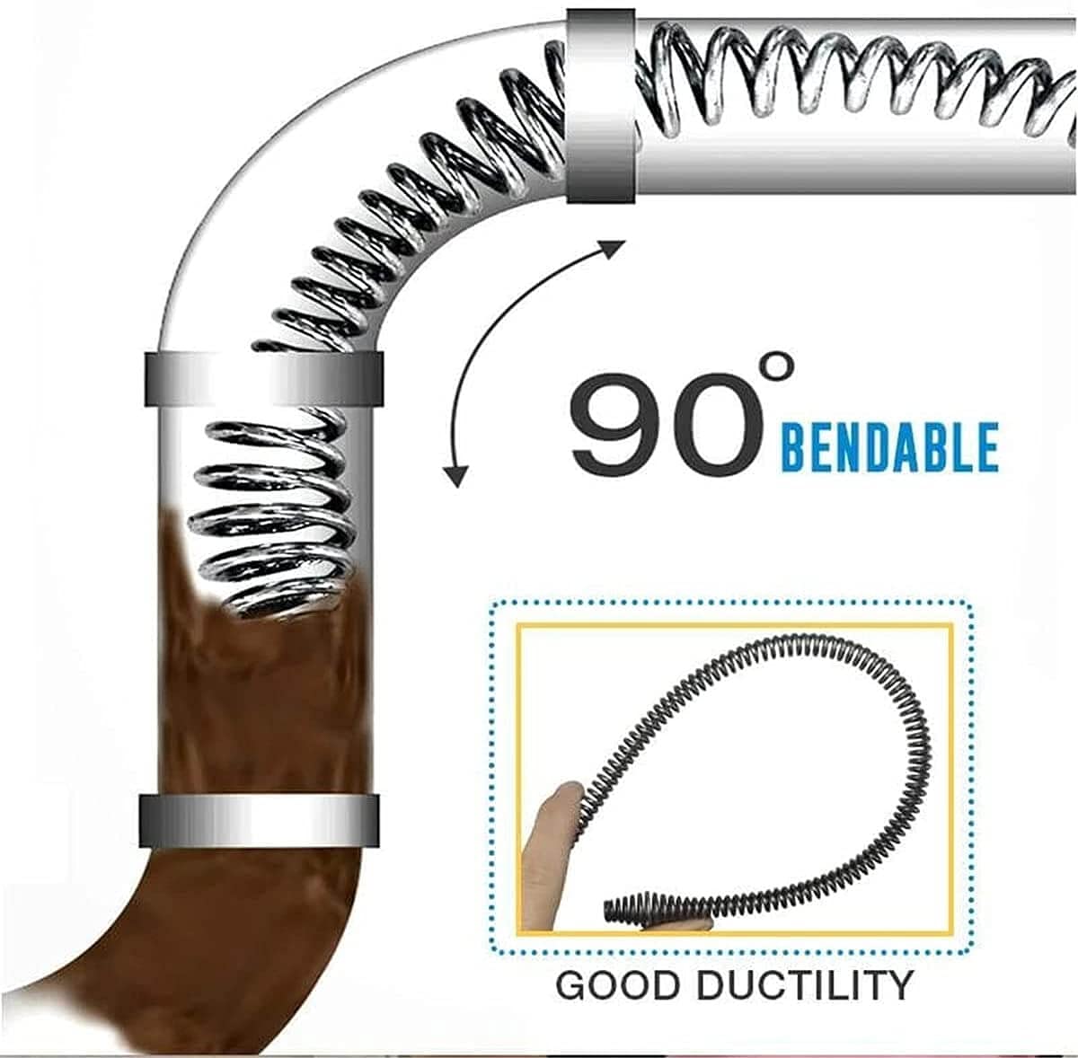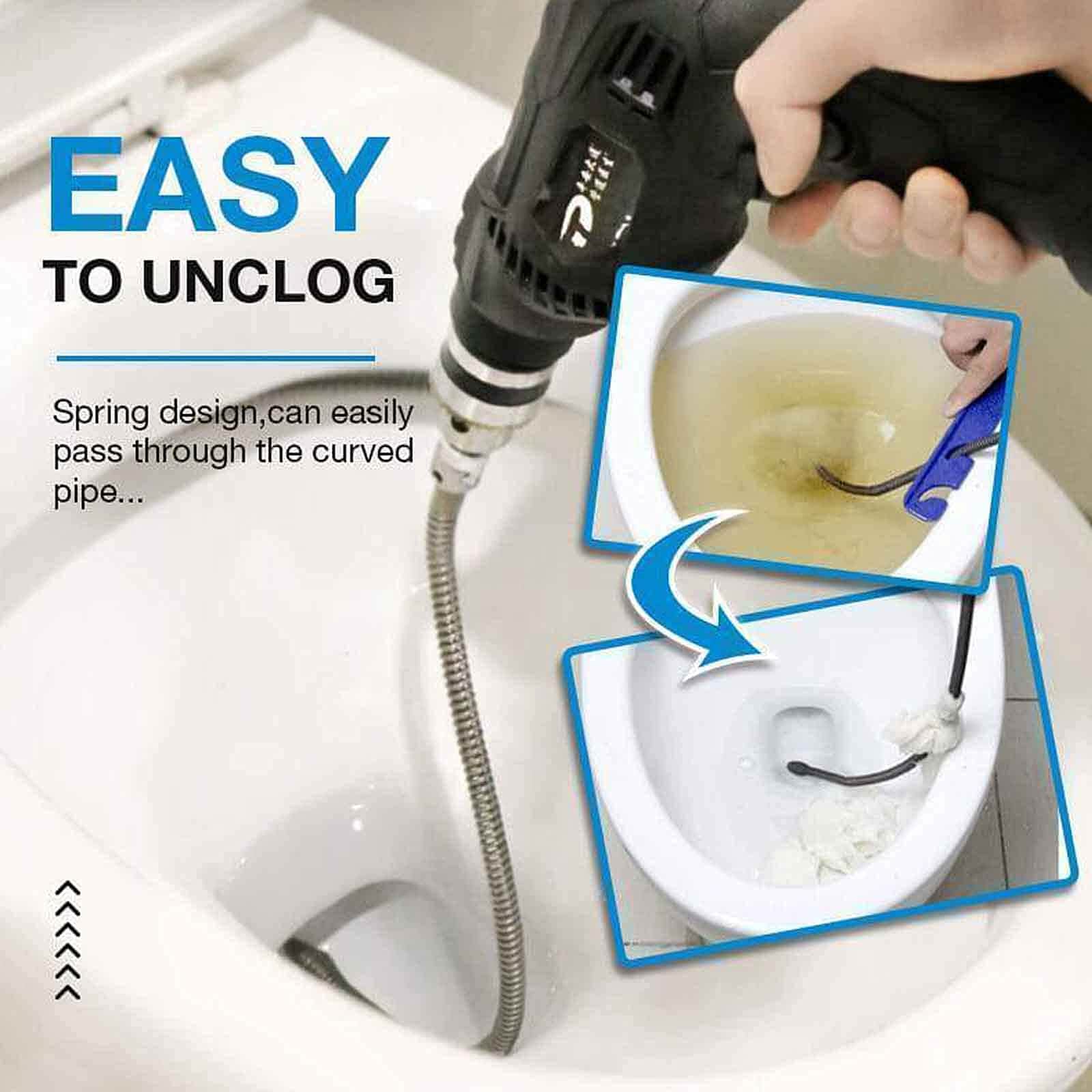 - CABEZAL DE RESORTE ESPIRAL: Diseño de resorte, flexible. Puede pasar fácilmente a través de la curva, destapando rápidamente la esquina muerta de la tubería y sacando los desechos bloqueados.