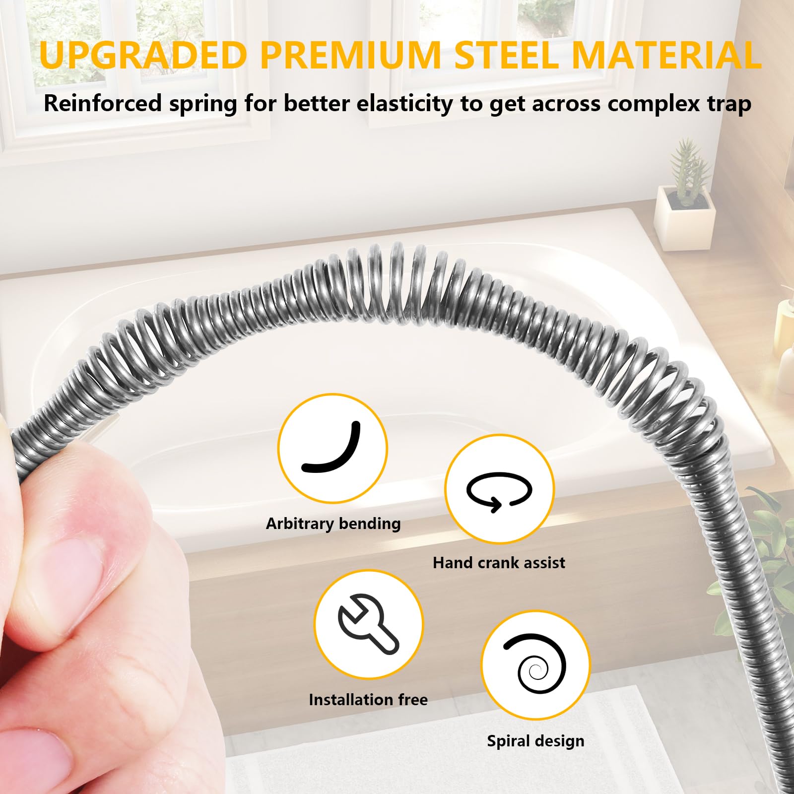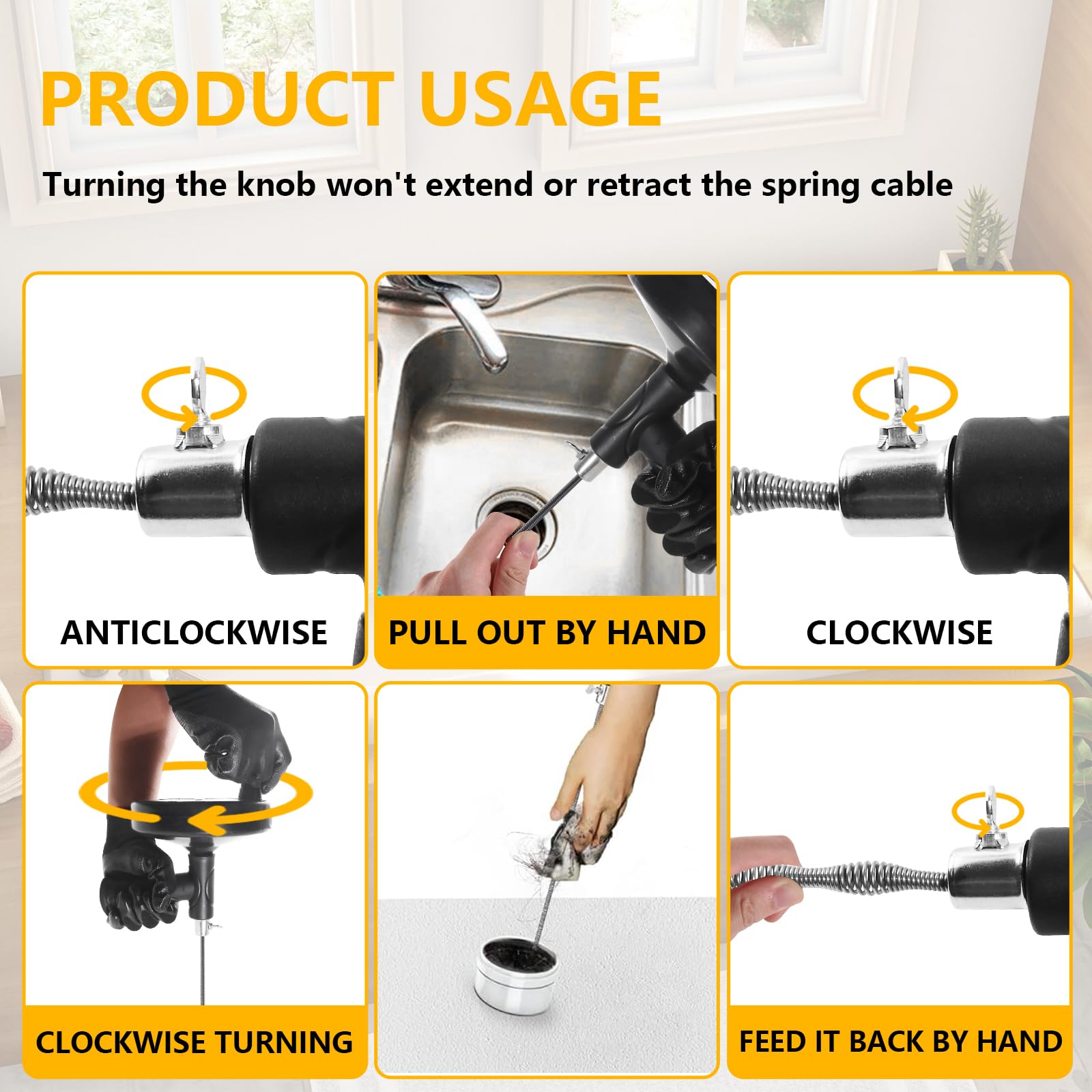 - Fácil operación e instrucciones de funcionamiento detalladas: la serpiente de drenaje tiene un agarre ergonómico de pistola que simplifica el uso y hace que sea más cómodo de manejar. El resorte flexible se puede doblar más de 90 grados sin romperse ni retorcerse, lo que te permite alcanzar los zuecos del fregadero de manera eficiente.