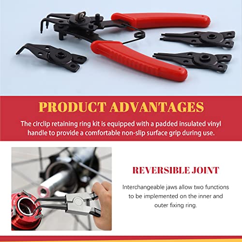 - 👍 Alicates de anillo a presión 4 en 1: 1 mango de alicates de 5 pulgadas, 2 mandíbulas de extremo recto de 180 grados, 1 mandíbula curva de 45 grados, 1 mandíbula curva de 90 grados. Este juego de alicates especiales de 4 piezas se utiliza principalmente en la eliminación de una variedad de clips de conexión especiales como anillos de retención, anillos de presión y extracción de círculos.