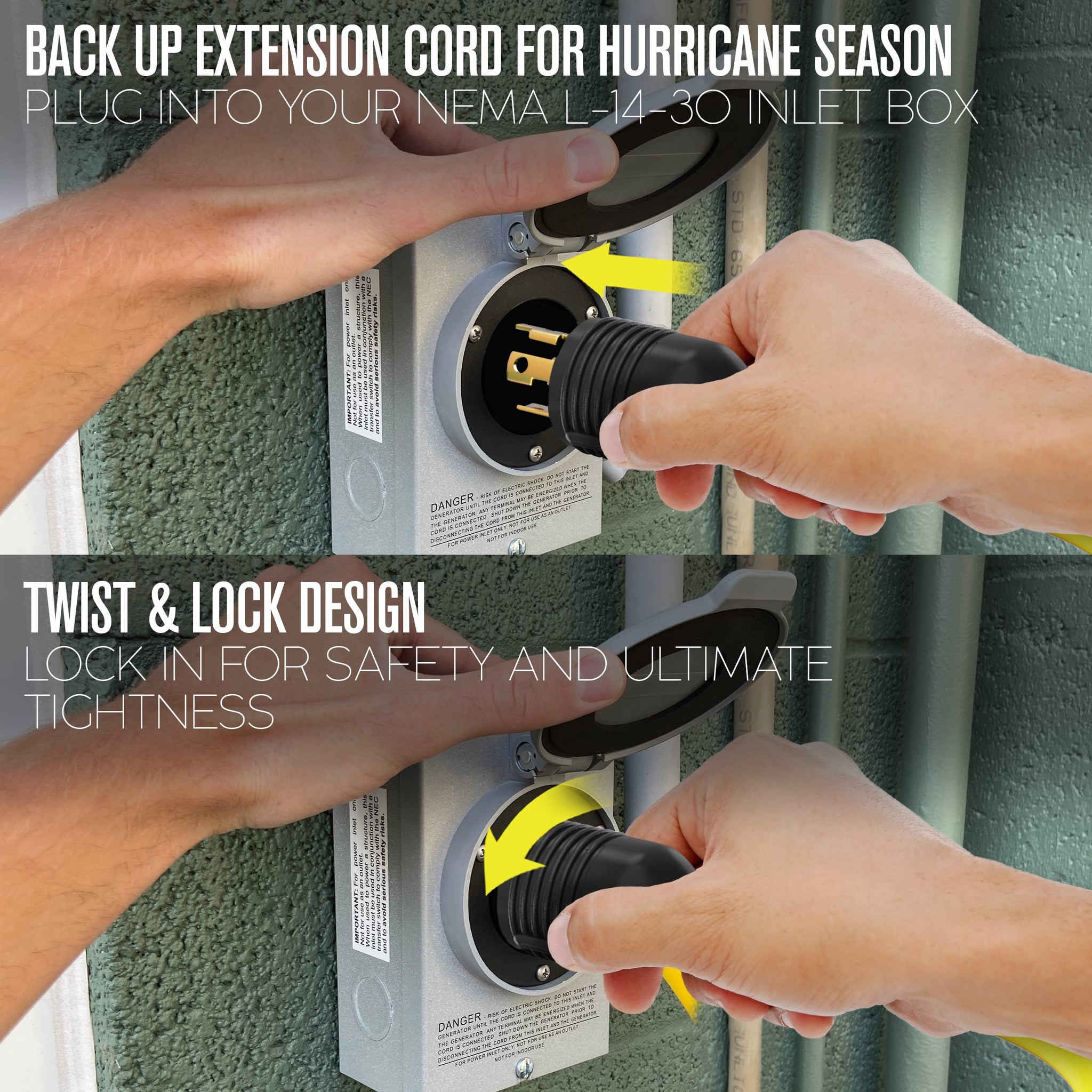 - MECANISMO DE TWIST AND LOCK: SJTW L14-30 que bloquea los cables de alimentación con un voltaje de 125-250. Los tapones de bloqueo tienen los pasadores dispuestos de manera circular. El tapón se inserta y se tuerce para bloquearlo en su lugar. Este cable se puede usar para hacer funcionar cualquier circuito en su panel de interruptores de hasta 30A. Es un cable ideal para llevar un generador de emergencia a la toma de corriente de la pared.