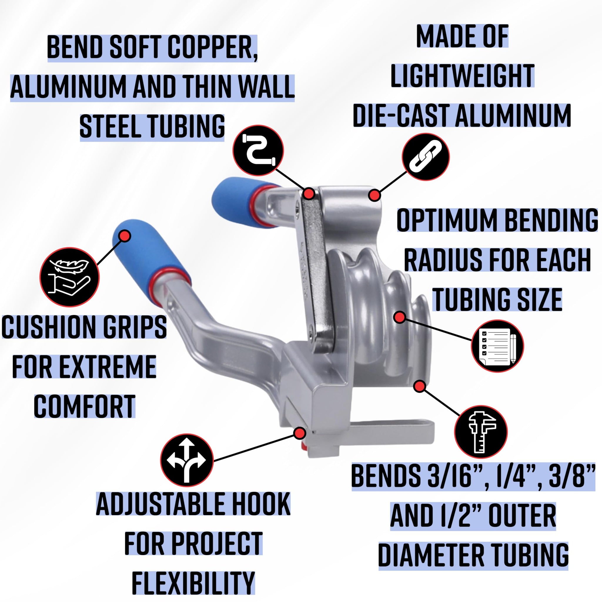 - Se dobla cobre suave, aluminio y acero: dobla 3 de los tamaños más populares de cobre suave, aluminio y tubos de acero de pared delgada con una herramienta resistente y precisa