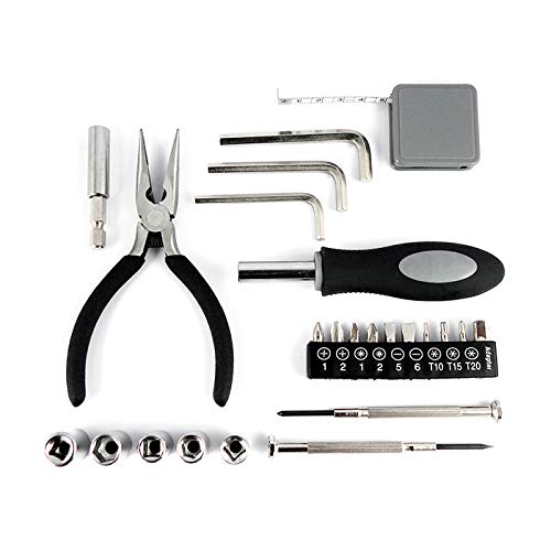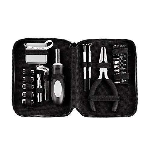 - CONTENIDO | Pinzas, 2 desarmadores de presición, 1 desarmador con 10 puntas intercambiables, 3 llaves allen, cinta métrica, 5 dados y mango para dados. Estuche de metálico con cremallera sólida y fuerte para mantener organizadas las herramientas.