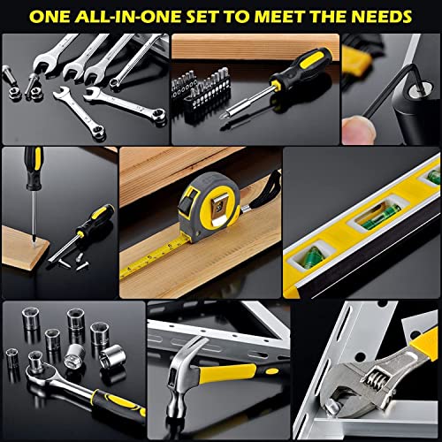 - ✅kit de herramientas de 108 piezas: Incluye martillo de garra, alicates de linero, alicates de punta larga, llave de carraca, regla de cinta de medición, alicates de lengüeta y ranuras, tomas de acción, puntas de destornillador, junta universal, barra de extensión y más. Contiene las herramientas necesarias para la mayoría de las pequeñas reparaciones de la casa.