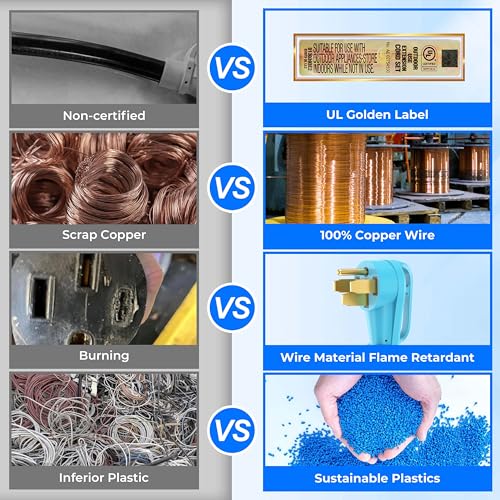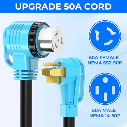 - Especificaciones: certificación UL, cable STW de calibre 6/3+8/1, 50A NEMA 14-50P macho a NEMA SS2-50R hembra; clasificado: 125/250 voltios, 6250/12500 vatios