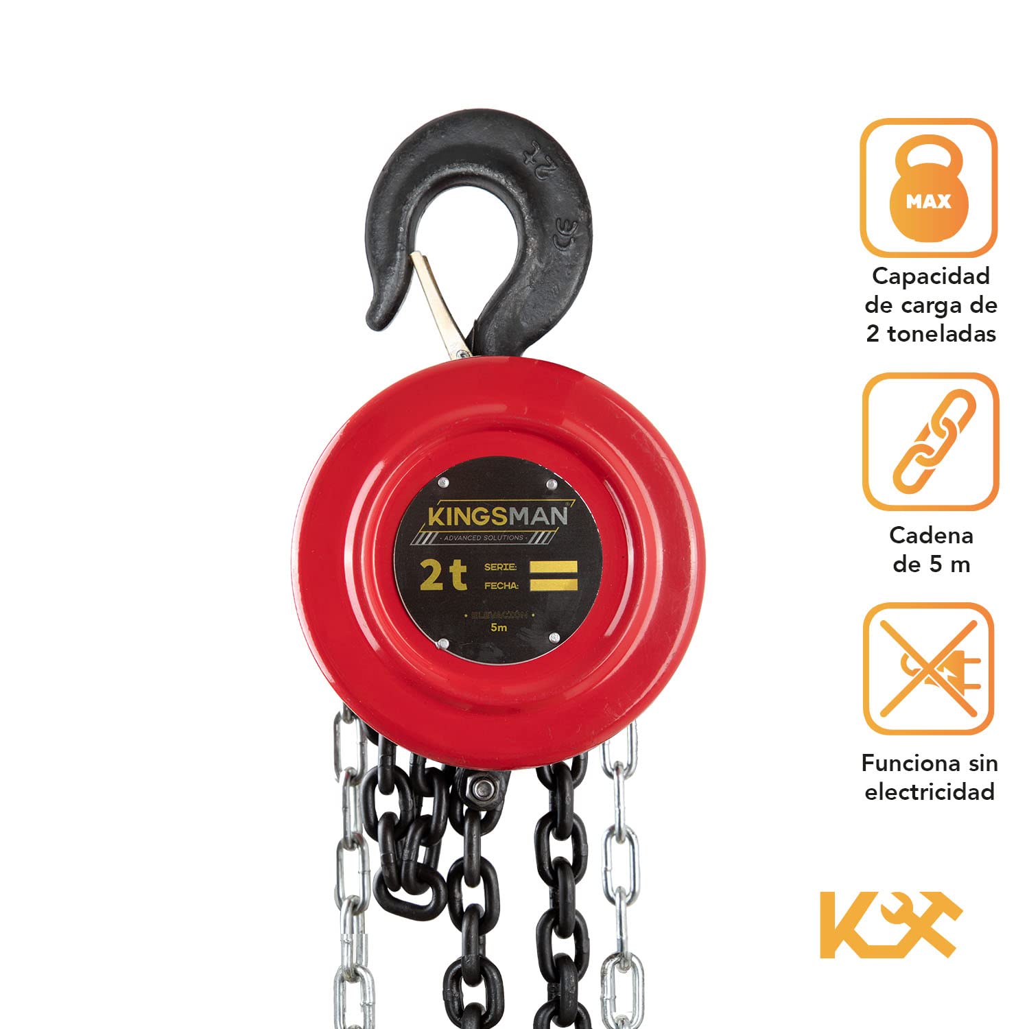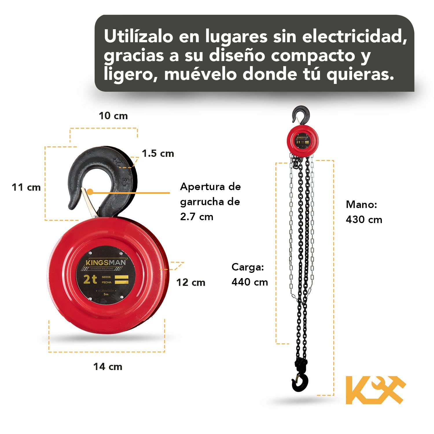 - ELEVACIÓN VERTICAL: Alta capacidad de carga de 2 toneladas a una altura máxima de 5 m, sus 2 cadenas (carga y mano) tienen un largo de 430 cm (mano) y 440 cm (carga) así como un grosor de 6 mm.