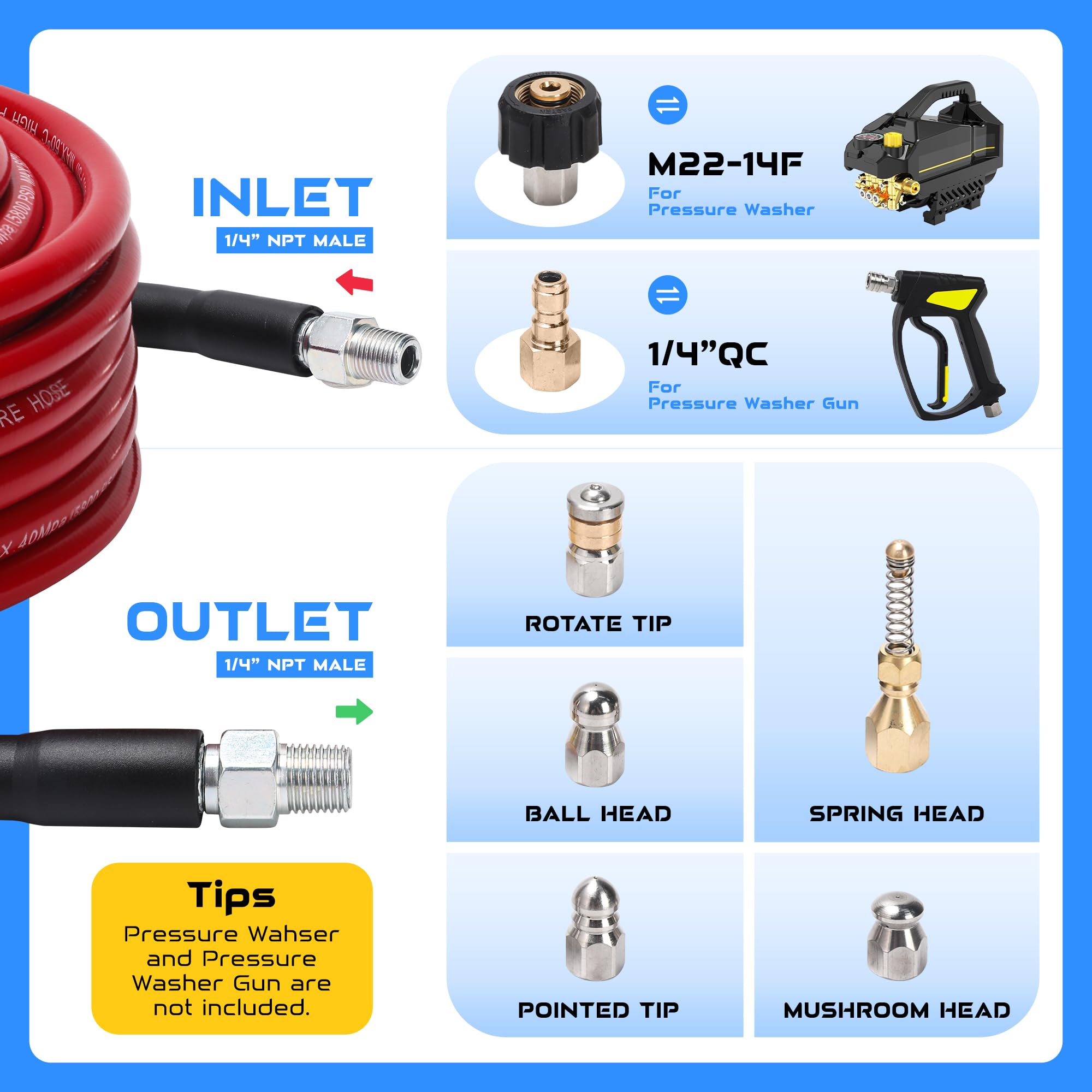 - Este kit de chorro profesional incluye una manguera de alcantarillado de 50 pies, 5 boquillas (resorte, esquina, rotación, seta), enchufe de conexión rápida, adaptador NPT M22 a 1/4 pulgadas, correa de asa, bolsa de almacenamiento, guantes, 2 spanner. estestestestestestestestCaja de pines de ramillete.
