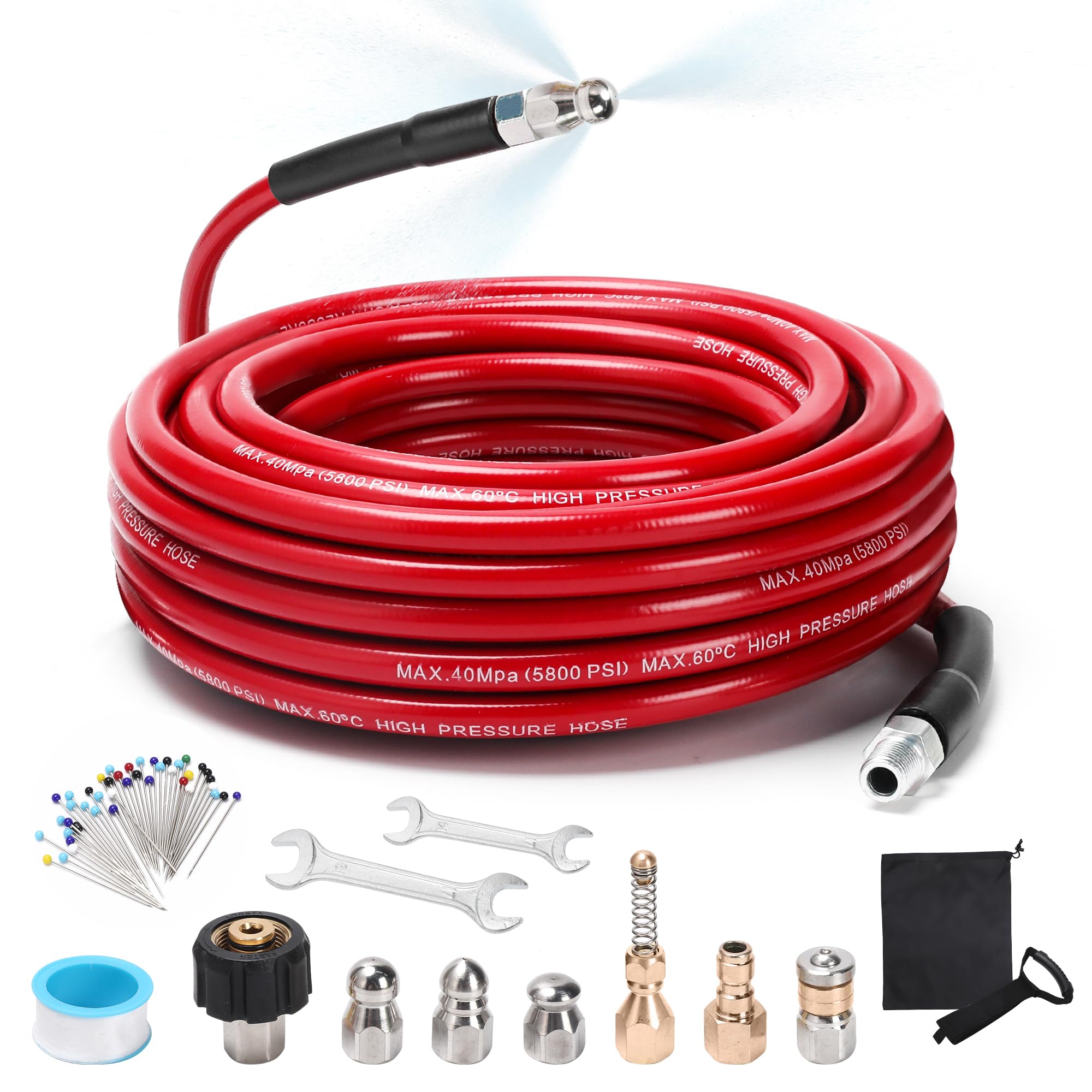 ▶ Kit de chorro de alcantarillado para lavadora a presión, manguera limpiadora de drenaje de 50 pies y 5800 PSI con esquina NPT de 1/4 pulgadas, boquilla giratoria y de botón, boquilla de chorro de
