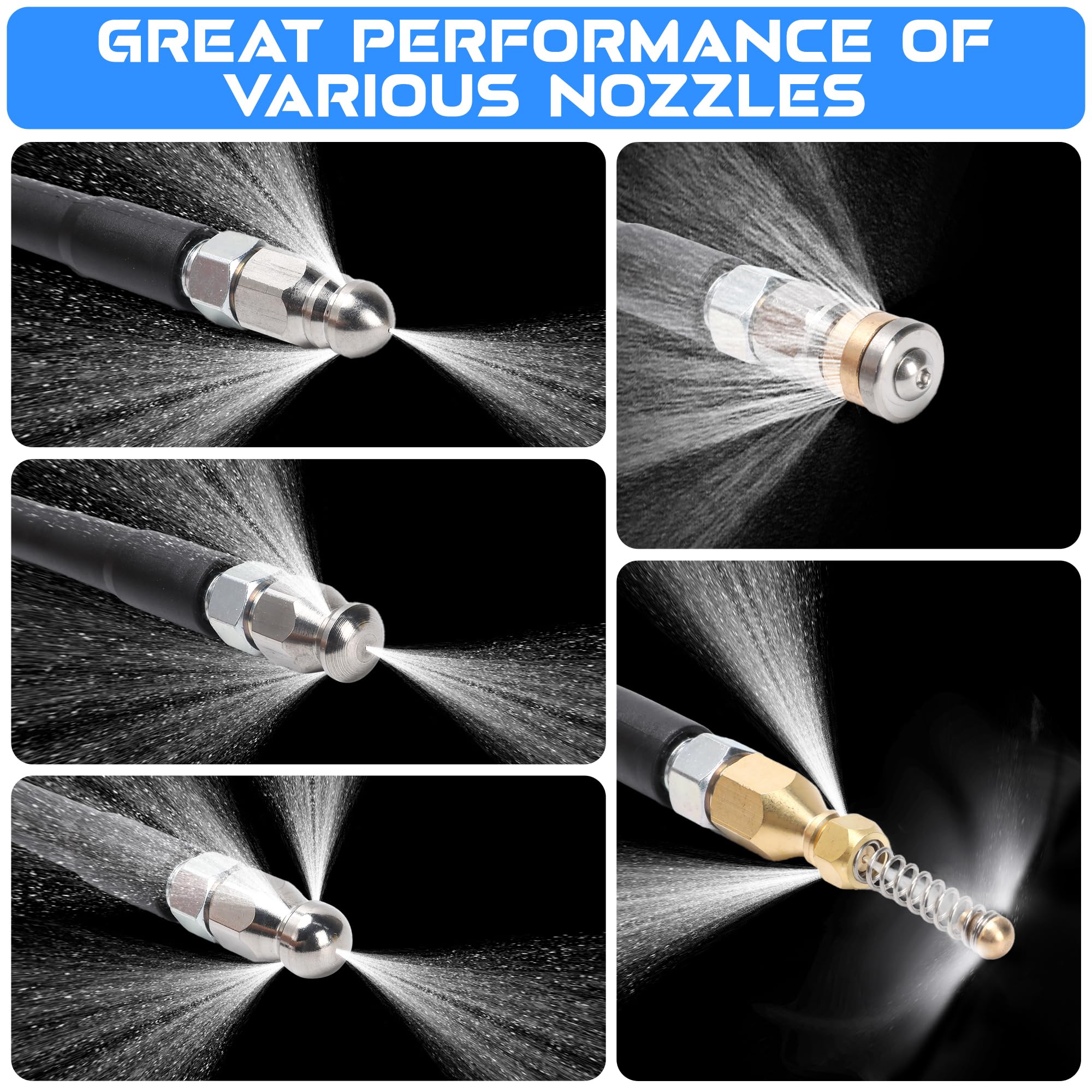 - Aborda cualquier zueco con 5 boquillas especializadas: resorte para mayor flexibilidad, apunta a presión hacia adelante, esquina para tubos angulares, rotación para fregar 360° y hongos para lavado de alta resistencia. Cada boquilla está diseñada para una limpieza de drenaje específica y eficiente.