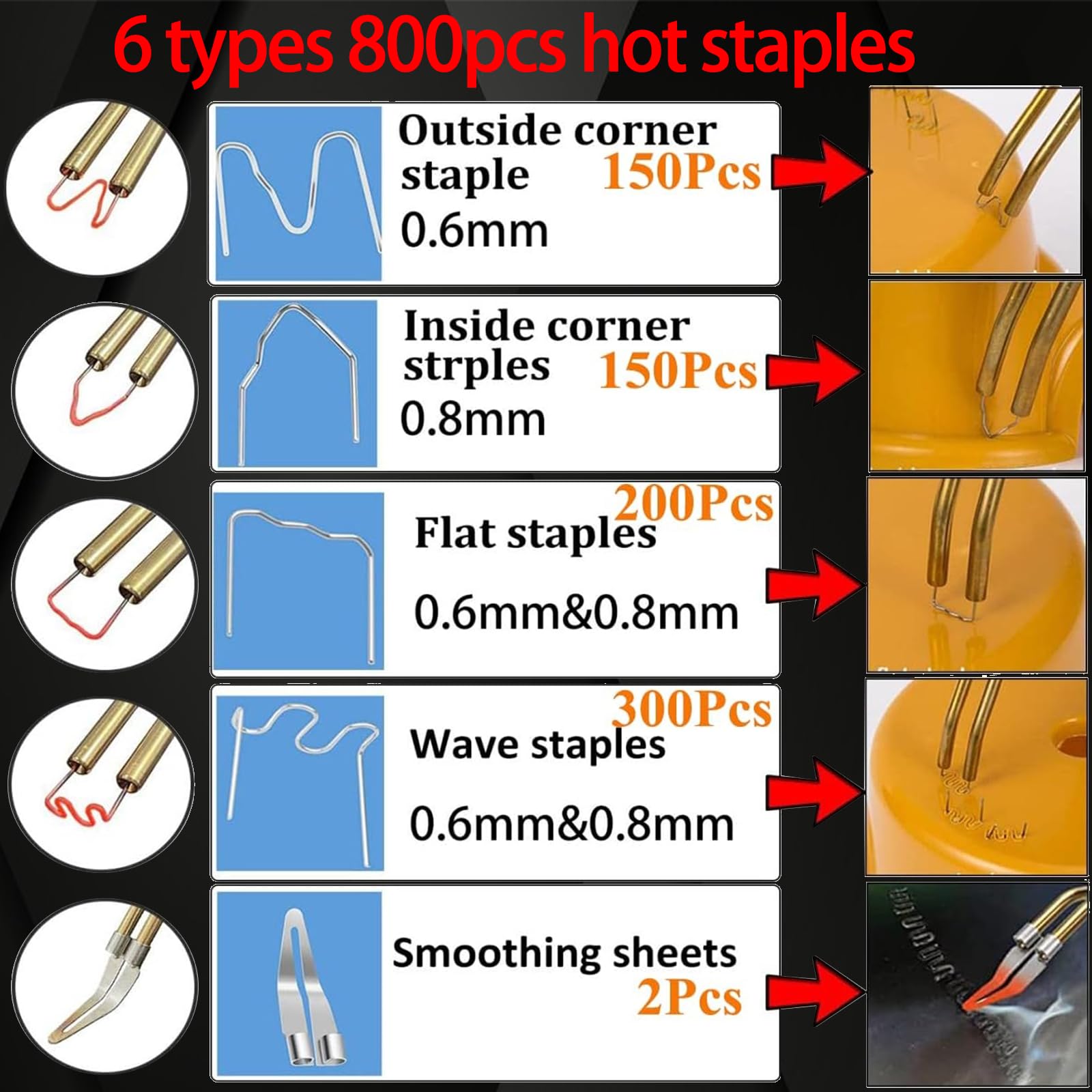 - Accesorios extendidos: la máquina de soldadura de plástico de 150 W está equipada con 6 tipos de 800 grapas calientes, 8 carreteras de soldadura de plástico y 2 cabezales de alisado térmico. 6 tipos diferentes de clavos y electrodos calientes para todas tus necesidades de soldadura. No hay necesidad de comprar grapas calientes adicionales, reduciendo costos para ti. Función 2 en 1, hace que tu trabajo de soldadura sea más profesional.