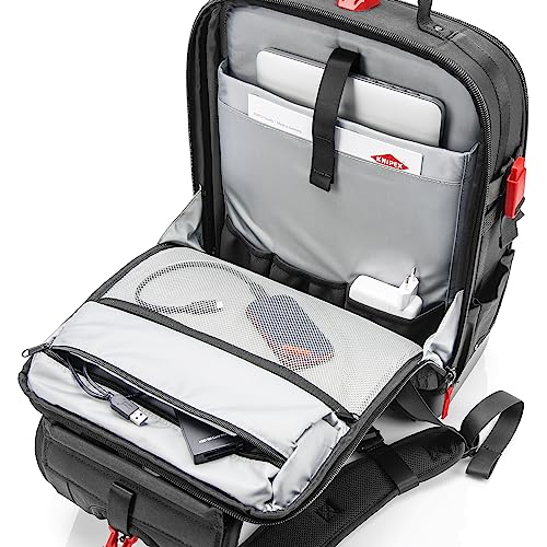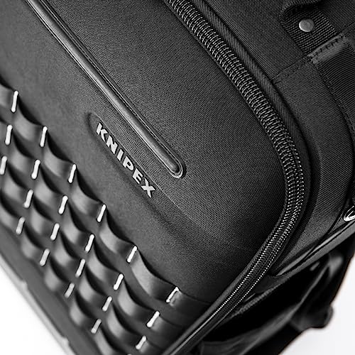 Detalles: Mochila de herramientas para transportar fácilmente hasta 33 libras. de herramientas y equipo a tu próximo sitio de trabajo. Compartimentos interiores duales; uno para almacenar tus herramientas y una sección acolchada para una computadora o tablet. La mochila ofrece 21 bucles de retención, 37 bolsillos, una tabla de herramientas extraíble y parte trasera acolchada para mayor comodidad al usarla. Los paneles delanteros y traseros se articulan totalmente para un fácil acceso a herramientas y suministros. Parte inferior moldeada impermeable (2.4 pulgadas de alto) hecha de plástico resistente a los impactos para una posición vertical segura cuando se abre y cierra. Una correa MOLLE en el interior y cuatro correas MOLLE en el exterior para fijar adaptadores, mosquetones o accesorios (no vendidos por KNIPEX). El conector magnético patentado FIDLOCK® distribuye uniformemente el peso de la carga, proporciona un cierre seguro y un fácil funcionamiento con una sola mano. La correa de equipaje permite una cómoda fijación a las asas telescópicas. Tela duradera hecha de fibras sintéticas recicladas sostenibles, a prueba de salpicaduras y fácil de limpiar. 20 7/8 pulgadas x 13 3/8 pulgadas x 8 1/4 pulgadas (alto x ancho x profundidad), peso aspiradora 6 libras. Capacidad de carga probada de hasta 33 libras. Se requiere registro del producto.