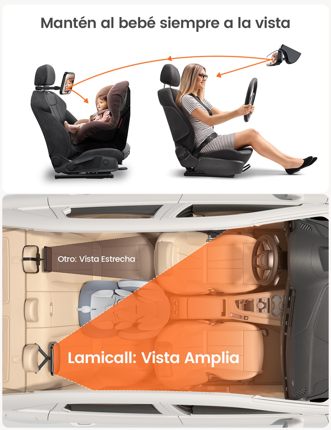 - 【Visión Clara y de 175° de Ángulo Ancho】¡Un espejo convexo de 175° de ángulo ancho que te ofrece una visión amplia para que siempre puedas ver a tu hijo! Garantiza una conducción segura mientras mantienes una visión clara de tu bebé en todo momento. El espejo para asiento de bebé en posición hacia atrás de Lamicall es un esencial articulos para bebe.