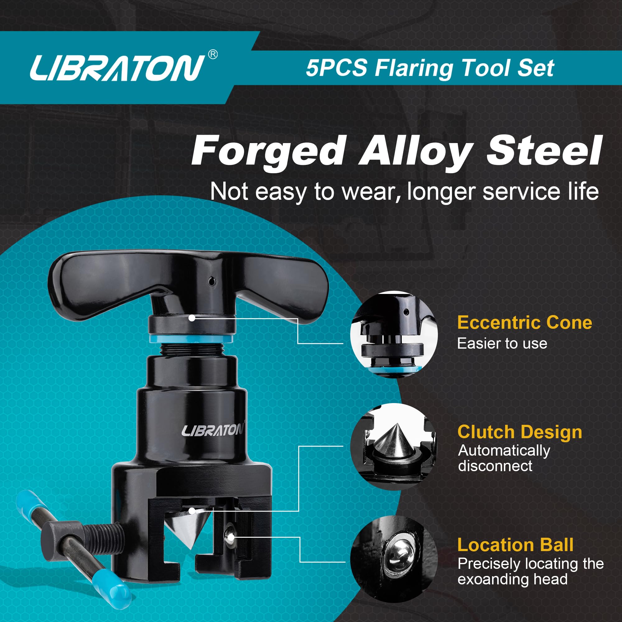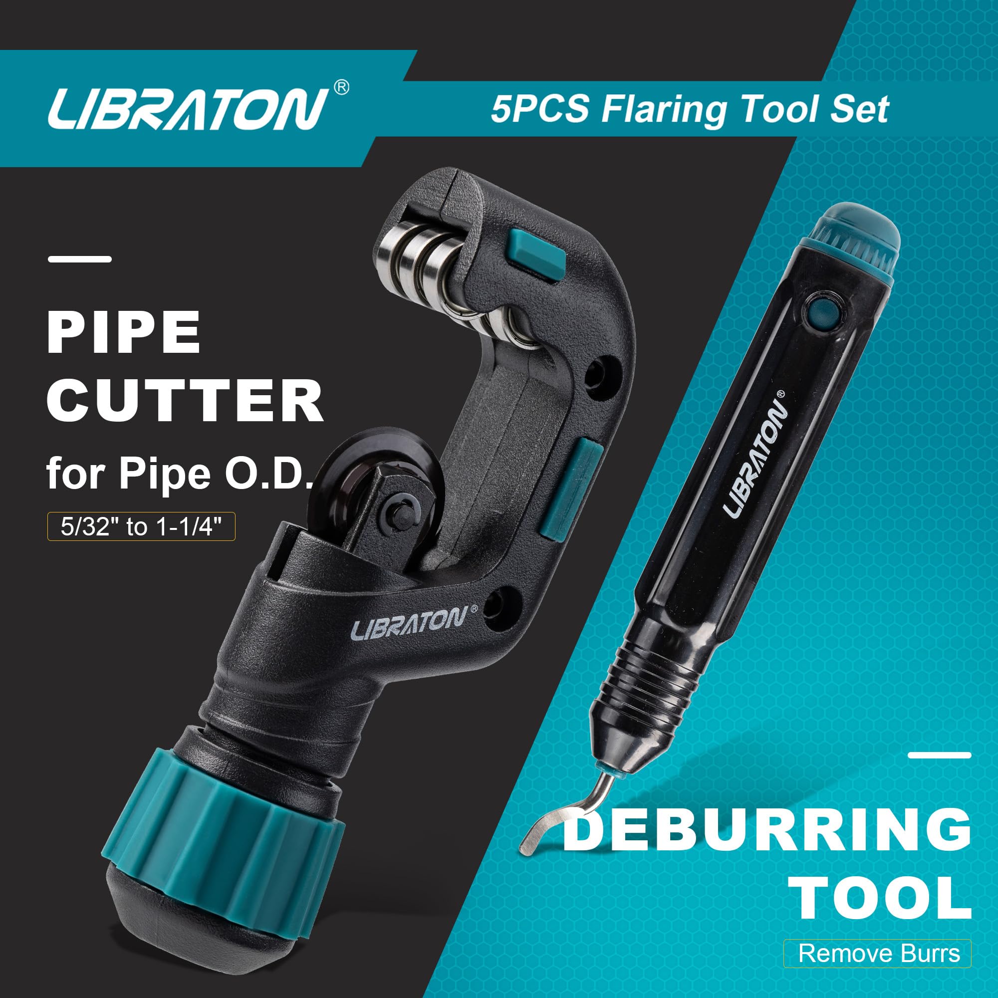 - [Herramienta de abocinamiento] El kit de herramientas de abocinamiento Libraton HVAC viene con 2 abrazaderas de abocinamiento para tuberías con diámetro exterior. 1/4", 5/16", 3/8", 1/2", 5/8", 3/4" (SAE) y tubos con diámetro exterior. 6 mm, 8 mm, 10 mm, 12 mm, 16 mm, 19 mm (métrico). El diseño de cono excéntrico de 45° hace que sea más fácil producir un brillo de calidad suave sin fugas (solo para una llamarada).