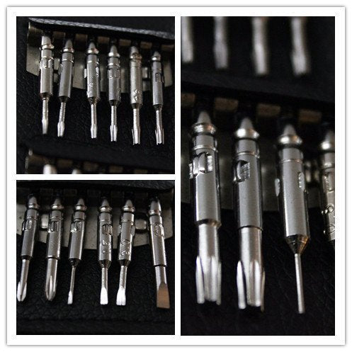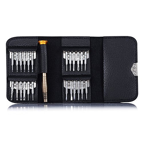 Detalles: LIHAO 25 en 1 Juego Destornilladores Precisión Magnético Set de Destornilladores Electrónica MIni Herramientas Reparación Desarmadores Precision para Celulares IPhone Reloj PS4 Cámara ComputadorasEspecificaciones:Material: Acero de aleación de Cantidad: 25pcs + 1 bolsa de guardadaCaracterísticas:Contiene gran cantidad de bits de destornilladores, incluye 24 herramientas + 1 mango con puntas magnéticas.Operar Fácilmente: Ensamble las diferentes tapas desatornillando el cuerpo del destornillador y luego colocando la boquilla. Una vez en su lugar, no se mueve más.Adecuado para desmontar o apretar todos los tornillos pequeños, por ejemplo usados para teléfonos móviles, ordenadores portátiles, juguetes, reloj de pulsera, relojes y vidrios etc.Una bolsa de guardada de piel se mantiene todos los herramientos de instalado. Gran juego de mini destornillador perfecto para uso en casa diaria o en el lugar de trabajo. Paquete incluye:10 x Destornillador Hexagonal Trox: T2, T3, T4, T5, T6, T7, T8, T9,T10, T155 x Cruz destornillador: 1,0 / 1,2 / 1,5 / 2,0 / 3,0mm diámetro4 x Destornillador plano: 1,0 / 1,5 / 2,0 / 3,0mm diámetro2 x Estrella pentágona destornillador : 0,8 / 1,2mm diámetro1 x Estrella triángulo: 2,3mm diámetro1 x Destornillador de tres puntos: 2,0mm diámetro1 x Destornillador redondo: 1mm diámetro1 x Mango destornillador1 x Bolsilla de cuero negro