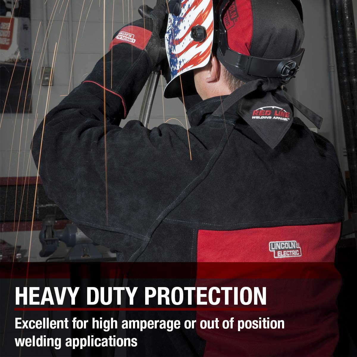 ▶ Lincoln Electric Chaqueta de soldadura de cuero resistente, ideal para soldadura de alto amperaje o fuera de posición, tamaño mediano, K2989M, negro/rojo