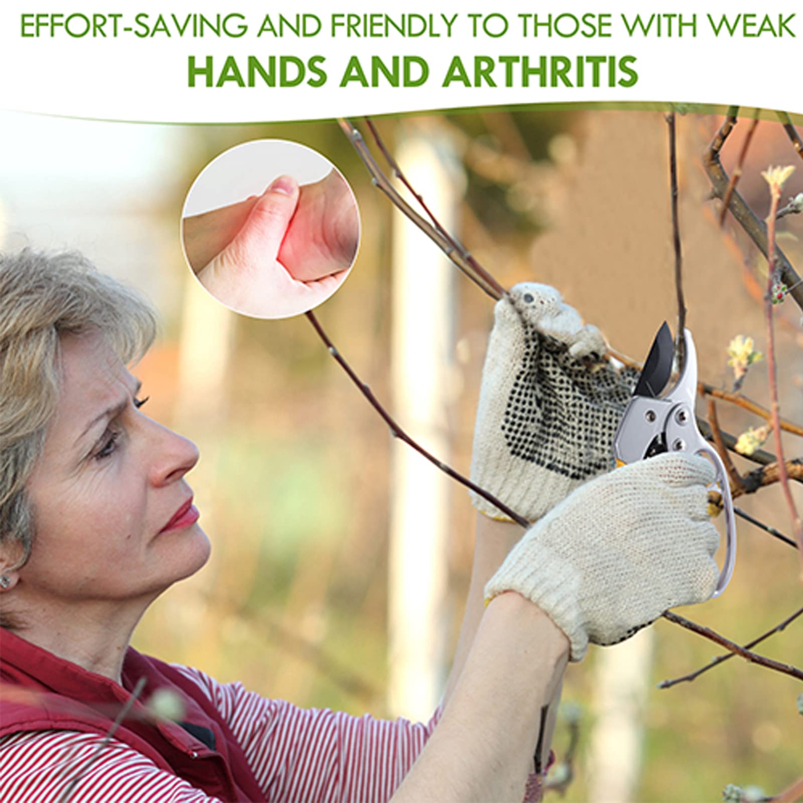 Detalles: Presentamos las cortadoras de jardín premium de 8.5 pulgadas, diseñadas con un innovador mecanismo 3 veces fácil de trabajar que reduce la tensión de la mano hasta en un 66%, lo que lo convierte en un cambio de juego para aquellos con artritis o manos débiles. Estos cortes resistentes cortan sin esfuerzo a través de ramas gruesas, tallos y vides, asegurando un corte limpio y preciso cada vez. Fabricado con materiales de alta calidad, estas cortadoras están diseñadas para durar y soportar las tareas de jardinería más duras. Con un cómodo agarre ergonómico y un diseño ligero, puedes podar y recortar durante largos períodos sin fatiga. Mejora tu experiencia de jardinería con estos versátiles y fáciles de usar, perfectos para mantener tus exuberantes espacios al aire última intervensión con facilidad.