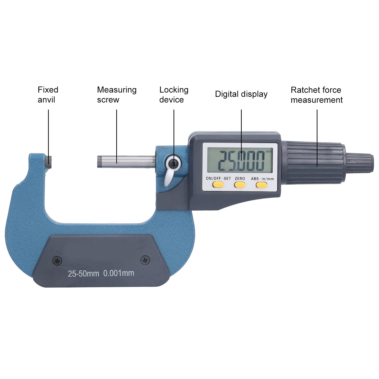 CALIBRADOR DIGITAL Micrómetro Digital Medidor de Pantalla Electrónico 0.00005in/0.001mm Grosor Medición de Diámetro Calibre 25-50mm