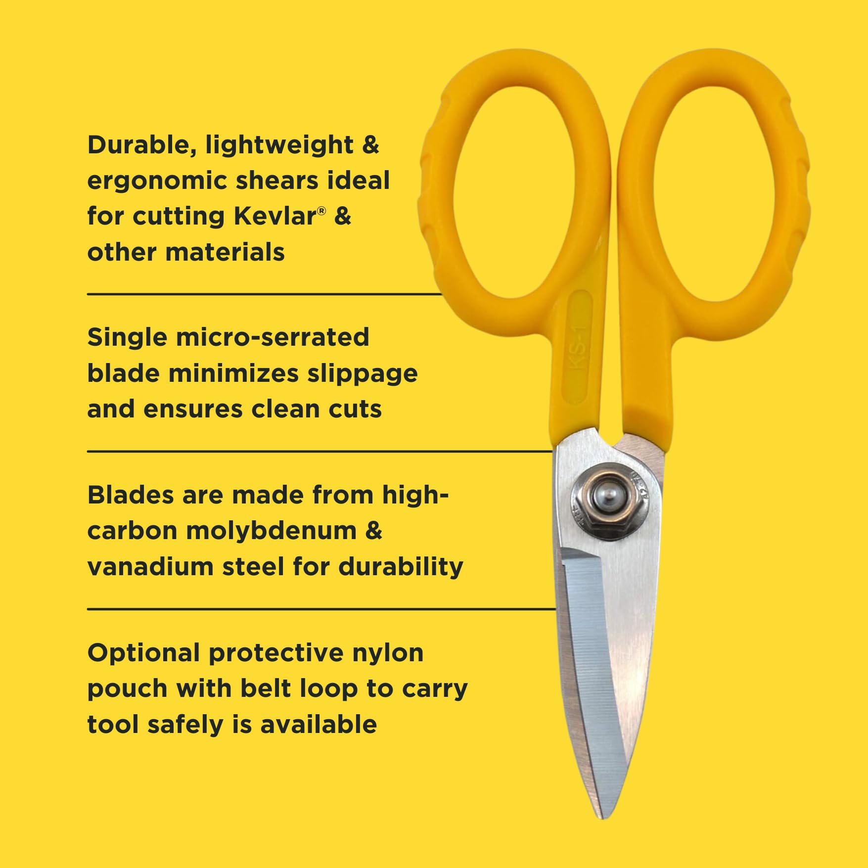 ▶ Miller KS-1 Tijeras de Kevlar de fibra óptica amarilla, fáciles de transportar para técnicos de trabajo, electricistas e instaladores, cortadores de cables de alta resistencia, 13,5 cm