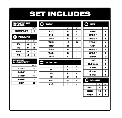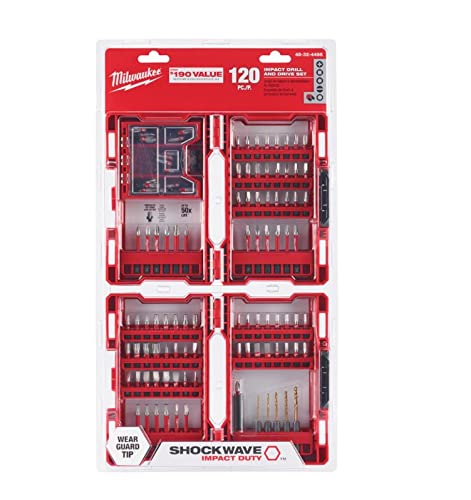 Detalles: Descripción general del producto: trabaja de manera más inteligente, no más duro con este juego de brocas y brocas de accionamiento de acero de alta velocidad de Milwaukee Shockwave. Cada tipo de punta está optimizado exclusivamente con geometría Shock Zone, por lo que tiene una vida útil 30 veces más y absorbe 3 veces más torsión que otras brocas de impacto. Este juego de 120 piezas ofrece la máxima durabilidad para las aplicaciones más exigentes. Estas brocas de destornillador se pueden utilizar en destornilladores o destornilladores de impacto. La geometría optimizada de la zona de choque absorbe el par máximo y evita que se rompa. La punta mecanizada personalizada evita que se pele y reduce el tambaleo. El acero 76 maximiza la resistencia al desgaste y los golpes. Brocas con diseño de hélice roja para una eliminación más rápida del material. Punto de división de 135° para un arranque de precisión; sin caminar brocas con revestimiento de titanio para 3X vida útil frente al óxido negro. Incluye 2 veces negro. Incluye 2 brocas de impacto SHOCKWAVE (60 piezas 3-40 40 29) Incluye: (2) soporte compacto para brocas, dos de 6 pulgadas. Soporte de brocas; tuercas magnéticas: dos 1/4 pulgadas, dos 5/16 pulgadas, adaptador de enchufe: dos 3/8 pulgadas. ; brocas hexagonales: dos 1/16 pulgadas, dos 3/32 pulgadas, dos 1/8 pulgadas, dos 5/32 pulgadas, dos 3/16 pulgadas, dos 1/4 pulgadas. ; bits de potencia de doble extremo: (2) ph2/sq2, (2) ph2/t25, (2) ph2/sl#10, (2) t20/t25; insertar bits de controlador: (2) ph1, (12) ph2, (2) pr2, (4) ph3, (2) sq1, (6) sq2, (2) sq3, (2) T111 0, (2) t15, (4) t20, (6) t25, (2) t30, (2) sl#6, (2) sl#10, (2) hexagonal 3/16 pulgadas, (2) hexagonal 1/4 pulgadas. ; 2 pulgadas. bits de potencia: (2) ph1, (8) ph2, (4) ph3, (2) sq1, (6) sq2, (2) sq3, (4) t20, (4) t25, (2) t30, (2) sl#10
