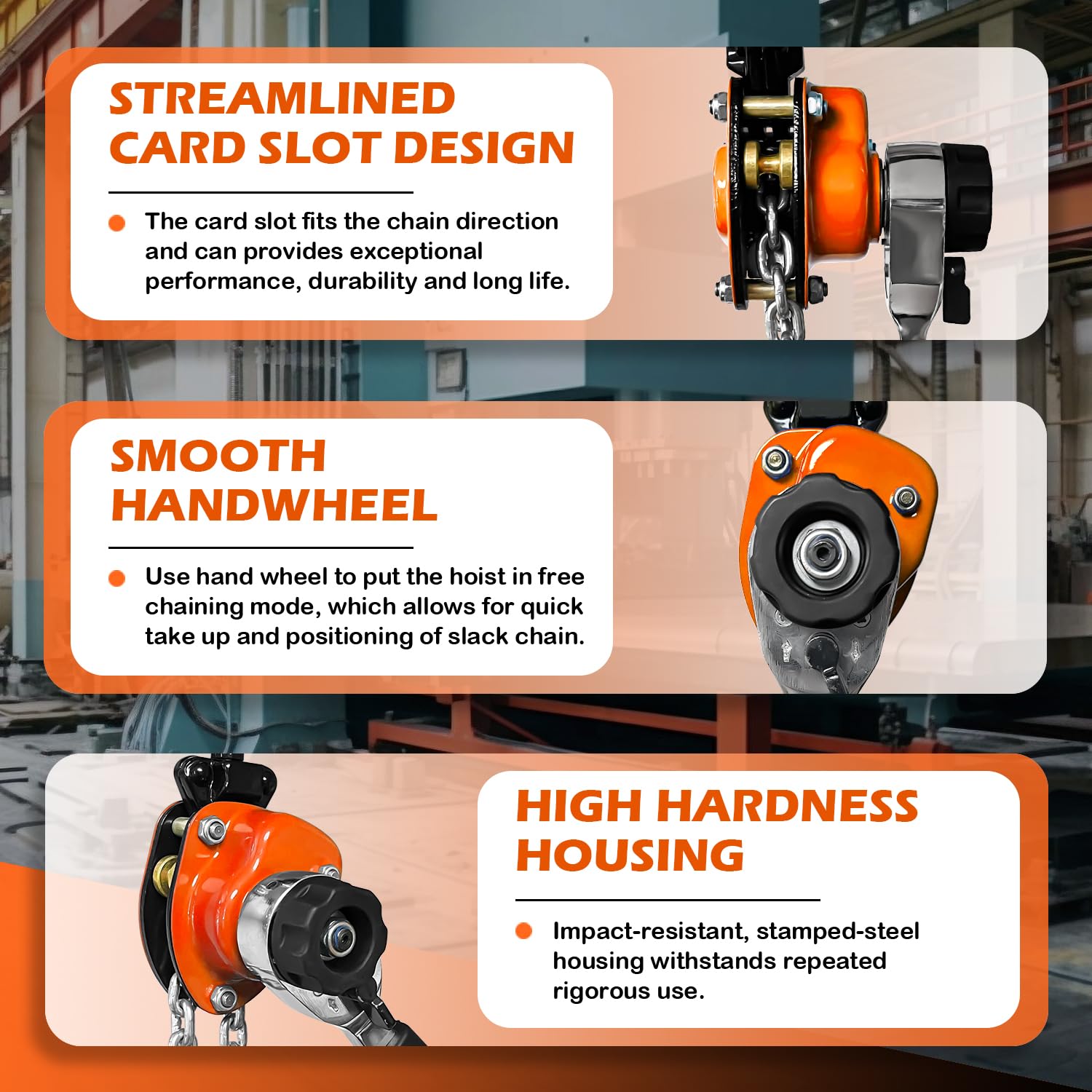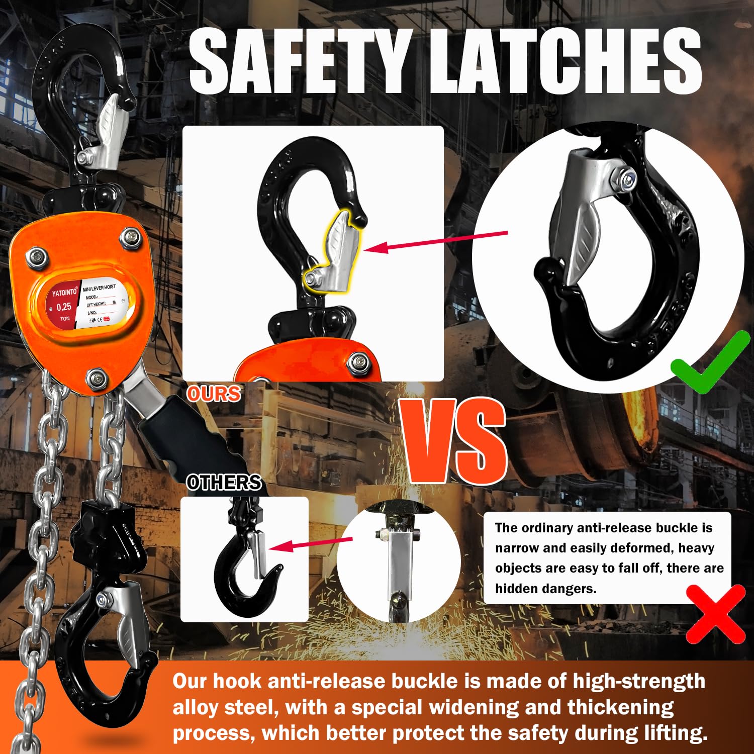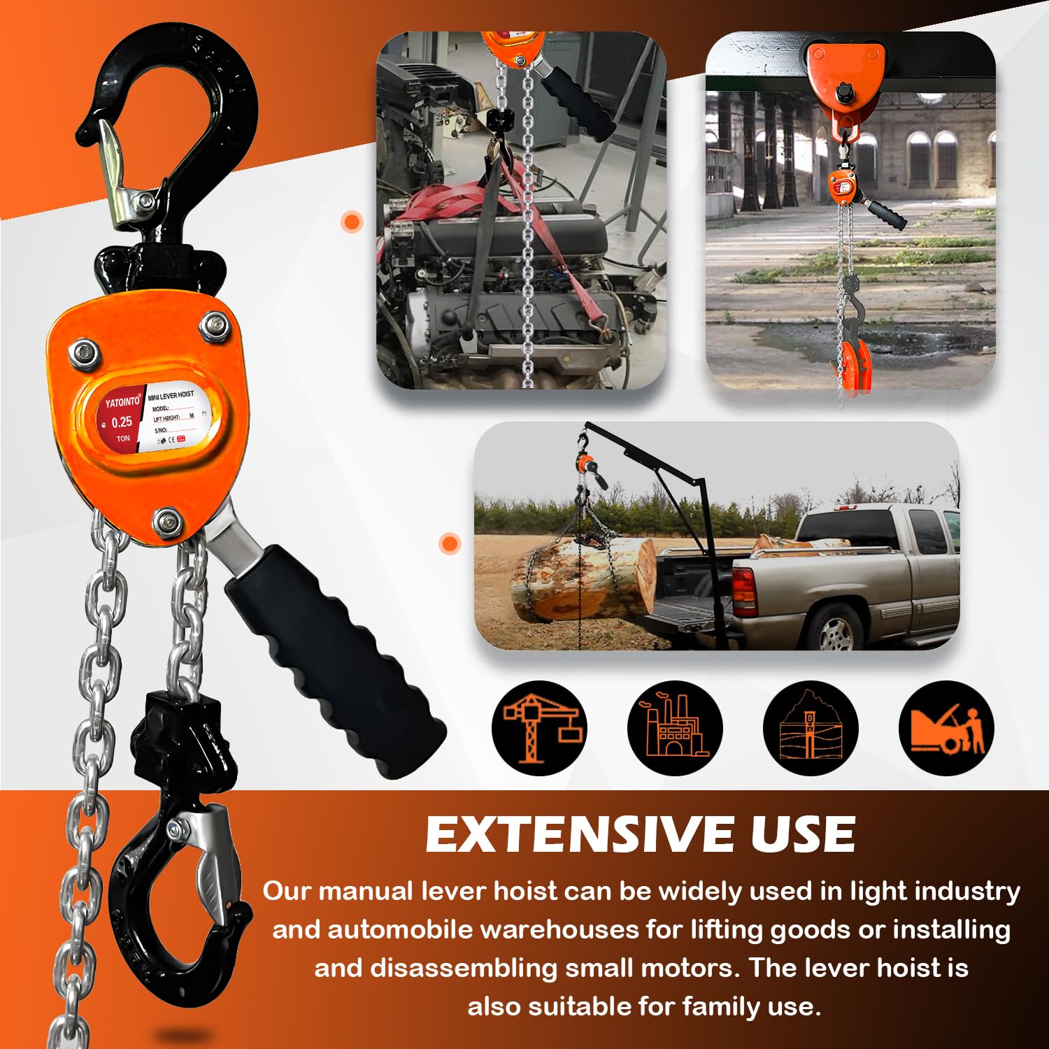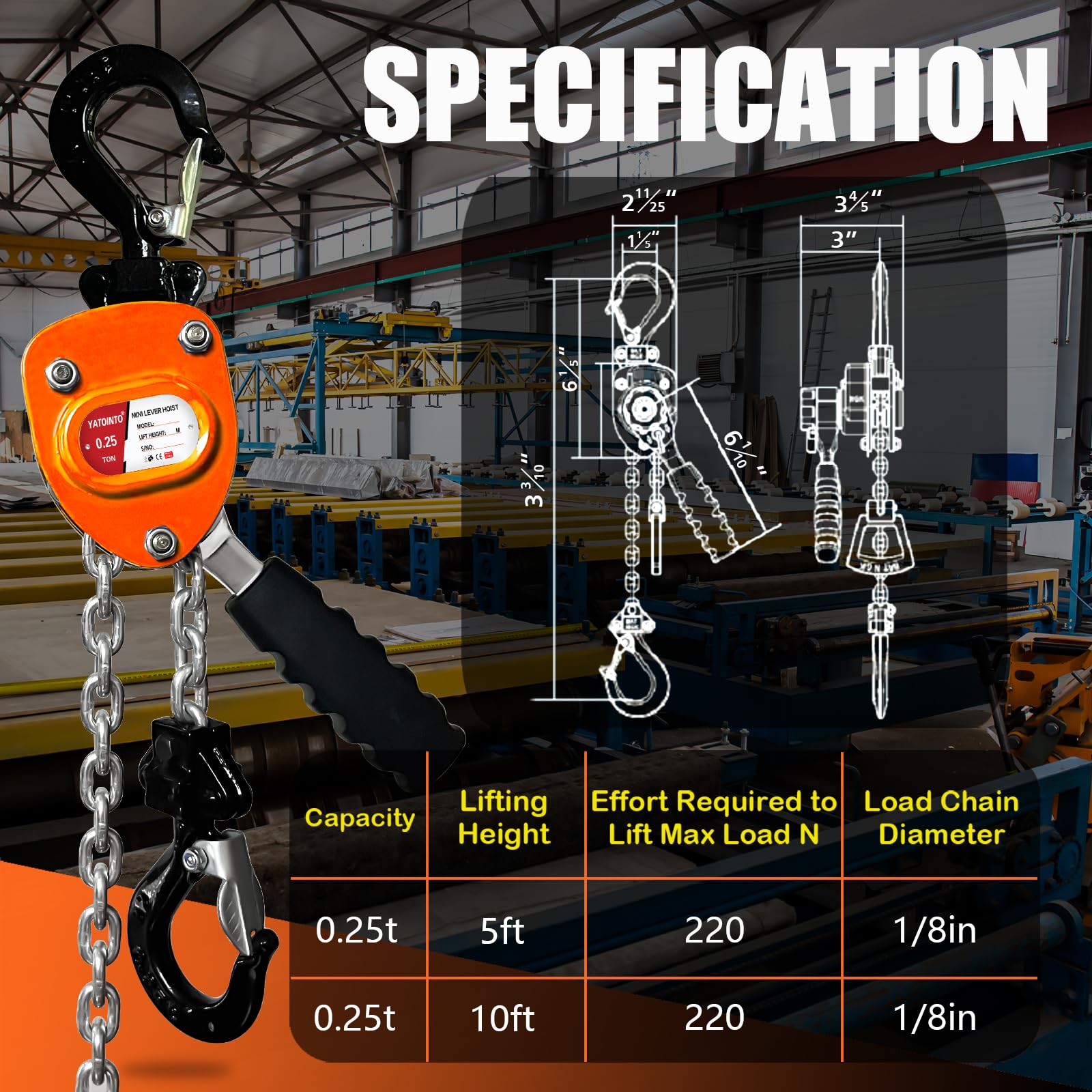- 🔥【Especificaciones y rendimiento】: el mini elevador de palanca levanta hasta 550 libras/0.25 toneladas y levanta hasta 1.5 m. El polipasto está hecho de acero de aleación, equipado con caja de engranajes gruesa, gancho de seguridad, cerradura de seguridad, cadena de acero de aleación especial G80 y gancho forjado en caliente, la cadena tiene suficiente tensión y resistencia para cargar objetos pesados.
