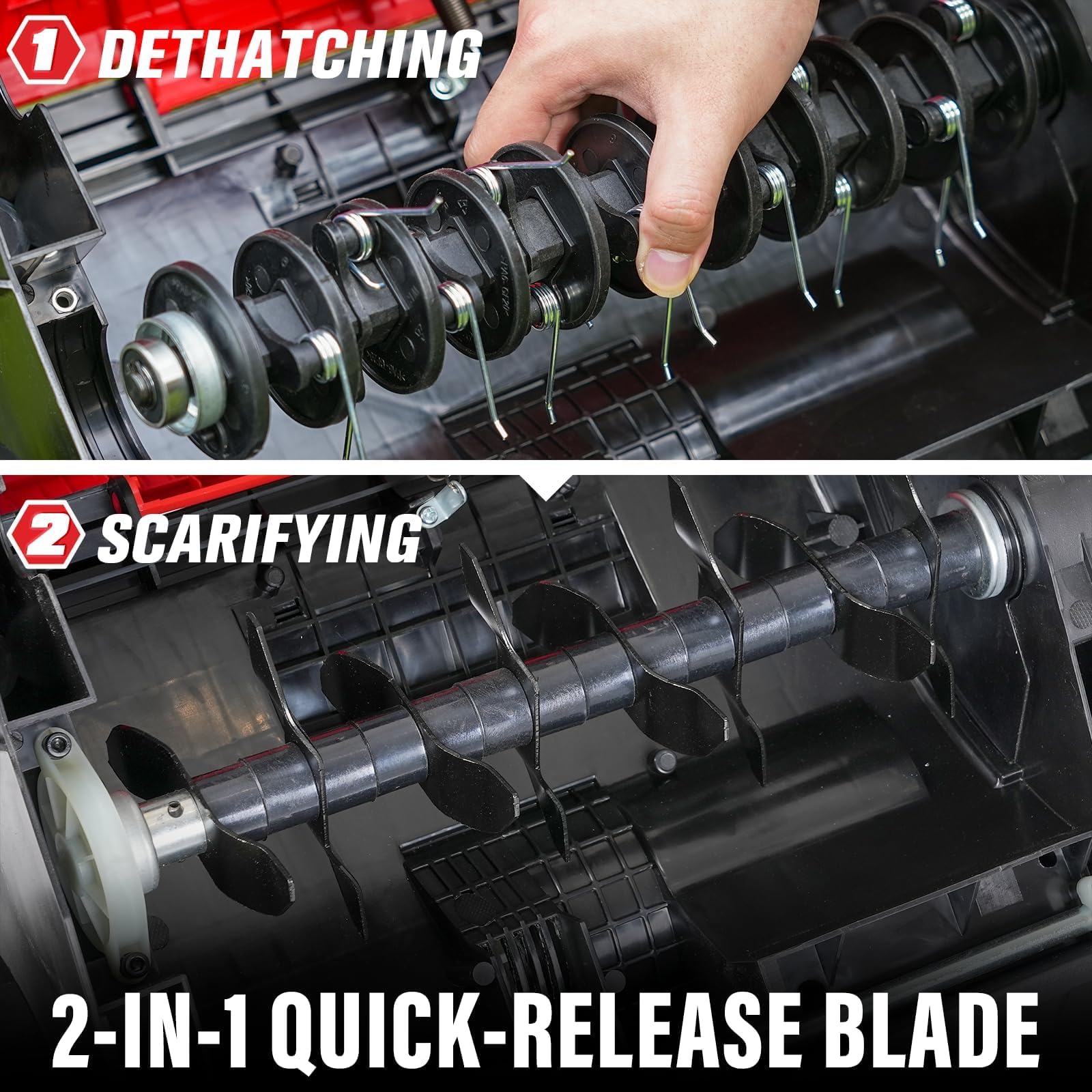 - [Cuchillas 2 en 1 de interruptor rápido]: utiliza el desthatcher para limpiar paja y musgo o cambia a escarificar para fomentar un crecimiento más profundo de las raíces y una mejor salud del piso. Esta versátil herramienta ofrece flexibilidad para diferentes necesidades de cuidado del césped.