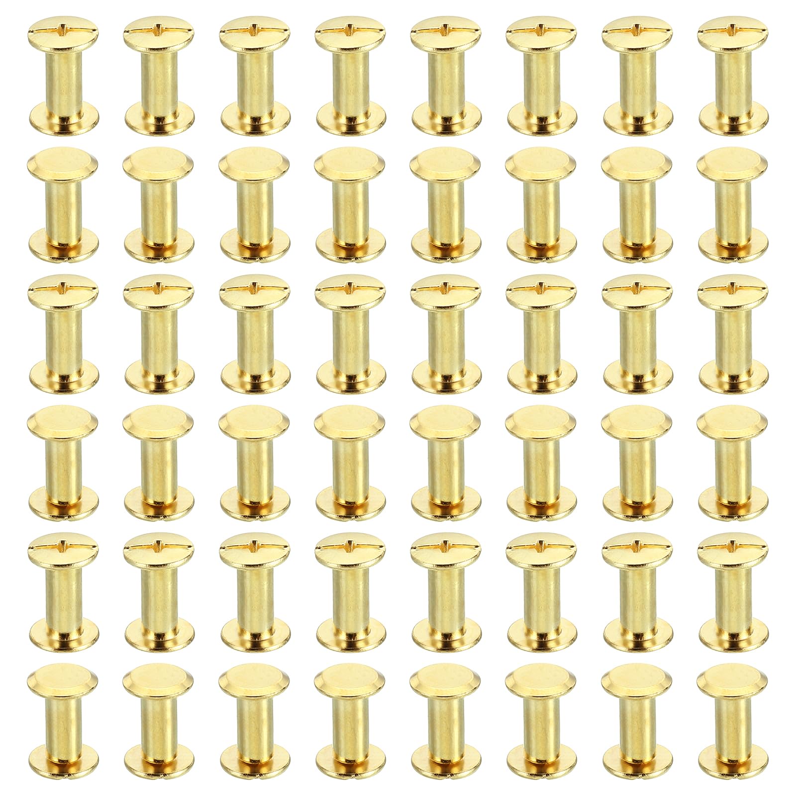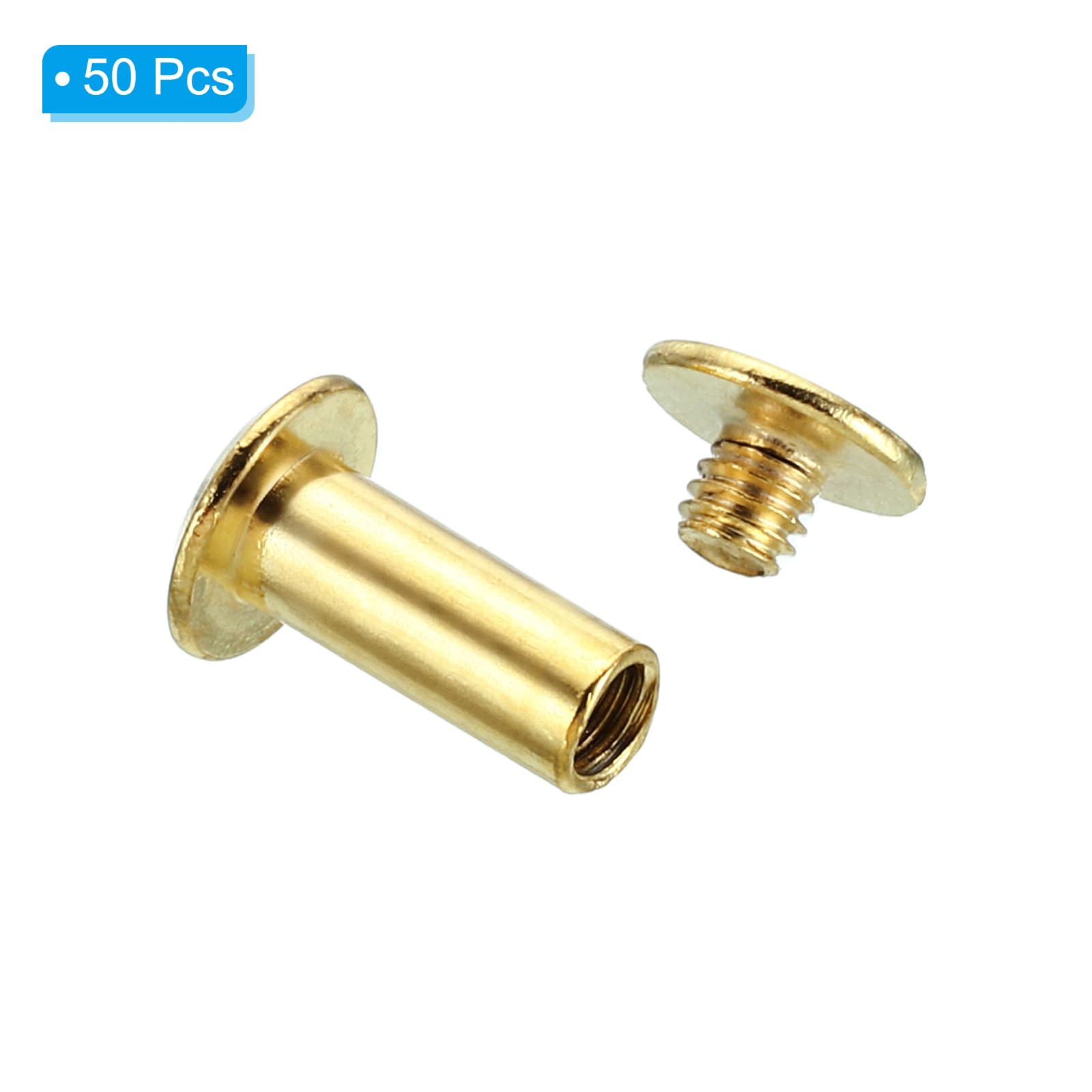 - Material: Acero al carbono con revestimiento de latón; Diámetro de la cabeza del tornillo y del poste: 9.5mm / 0.374 pulgadas; Diámetro del tornillo: 4mm / 0.157 pulgadas; Diámetro del poste: 5mm / 0.2 pulgadas; Longitud del poste: 12mm / 0.47 pulgadas; Longitud del tornillo: 4mm / 0.16 pulgadas; Lista de paquetes: 50 tornillos, 50 postes;