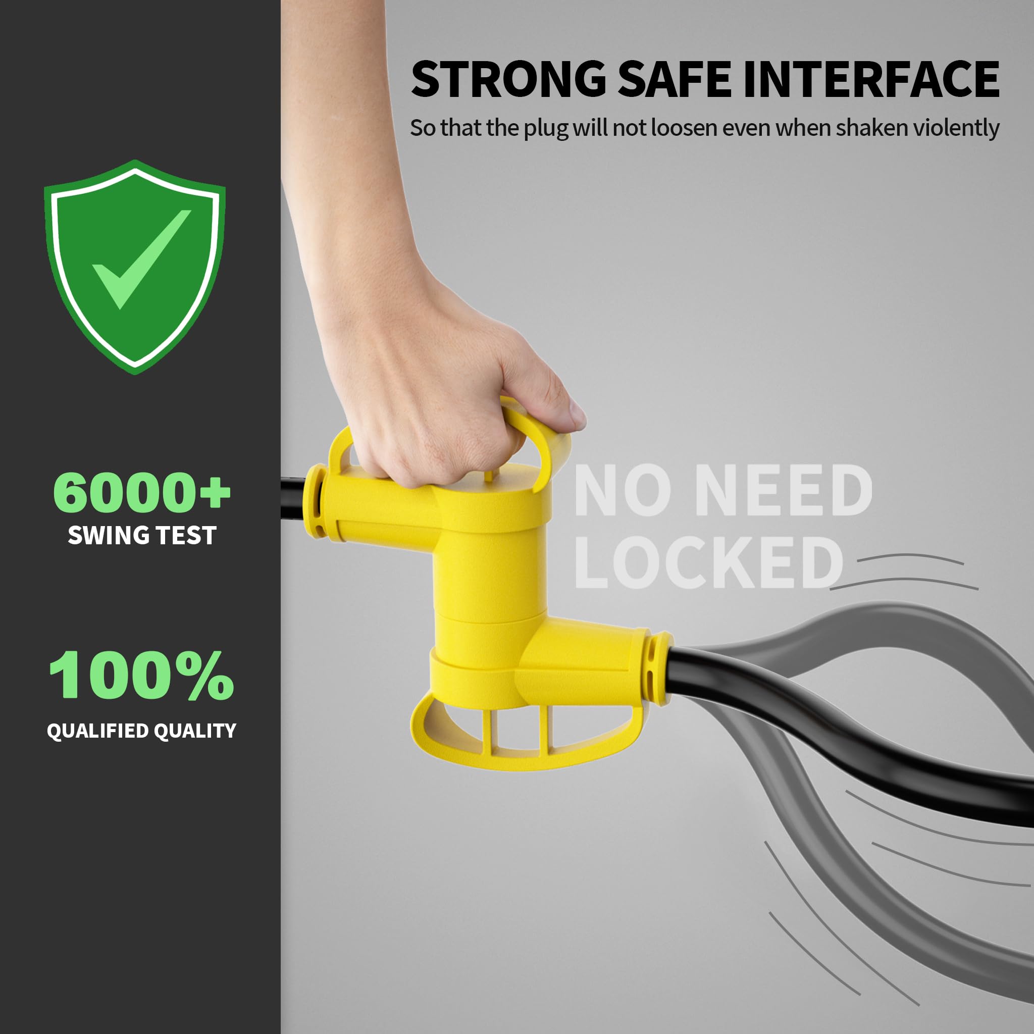 - Diseño fácil de usar: el cable de extensión RV de 50 amperios tiene mango aislado, más espacio en el mango, por lo que puedes conectar y desenchufar fácilmente sin dañar el cable de RV, por lo que es más seguro de usar