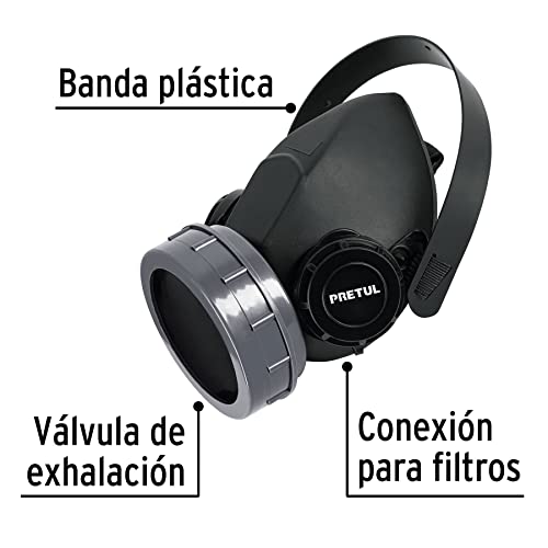 Detalles: Pretul RES-1-P, Respirador sin cartucho, 1 filtro, Pretul - Fabricado en hule - Válvula de exhalación - Banda elástica ajustable - Cartucho intercambiable - Reutilizable - Respirador de media cara - Compatible con cartuchos de repuesto Pretul