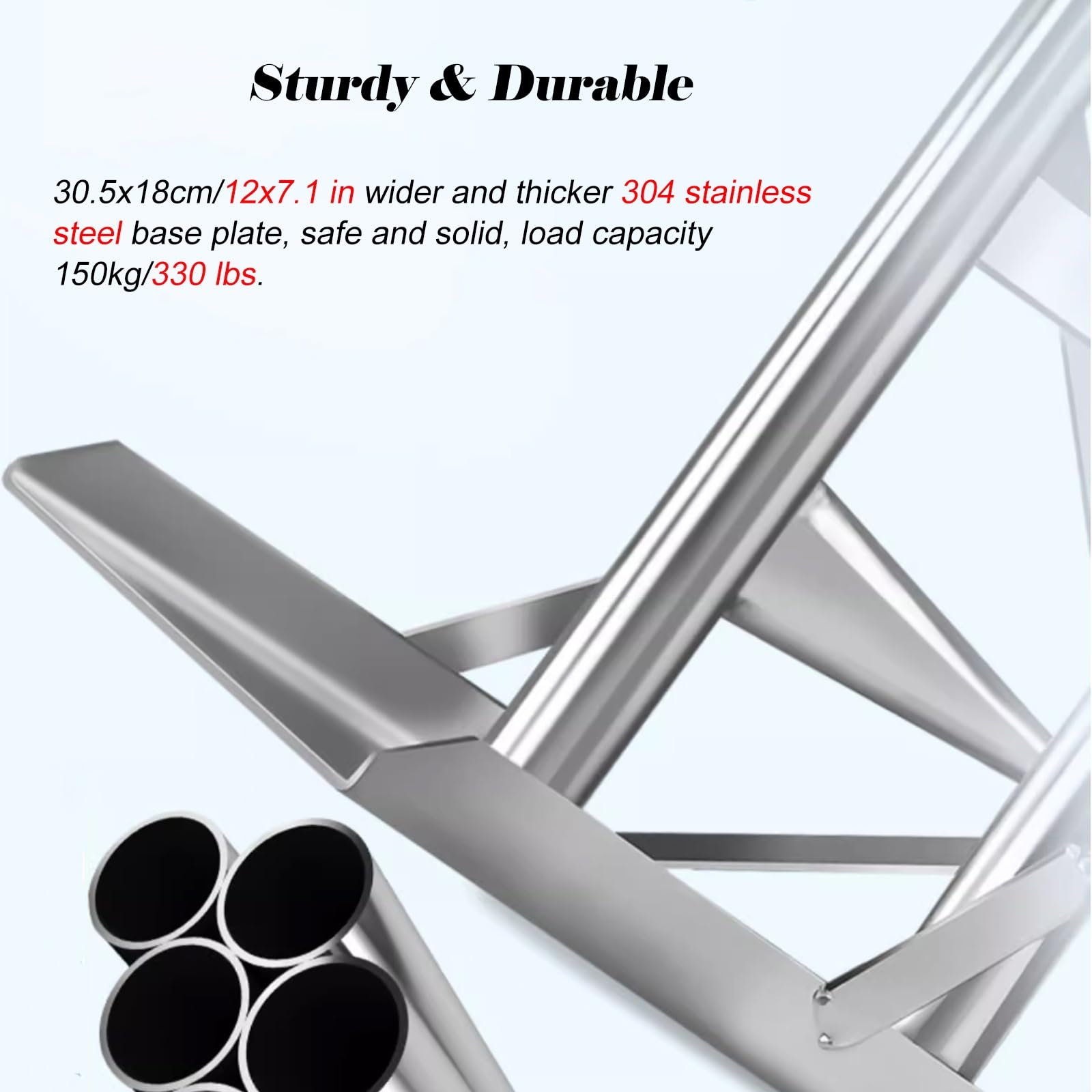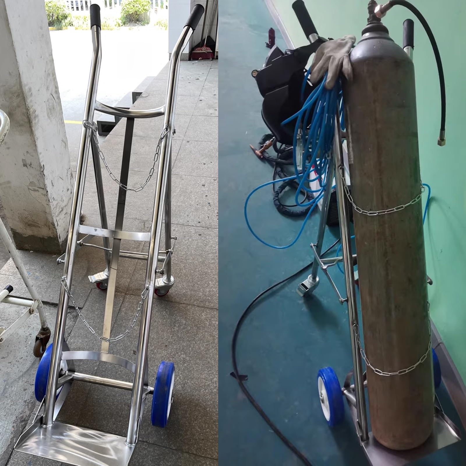 - Acero inoxidable 304: El carro del cilindro de gas está hecho de acero inoxidable 304, que es antioxidante, anticorrosivo, suave y fácil de limpiar, resistente a grietas y rayones, etc., y puede soportar 150 kg/330 lbs.