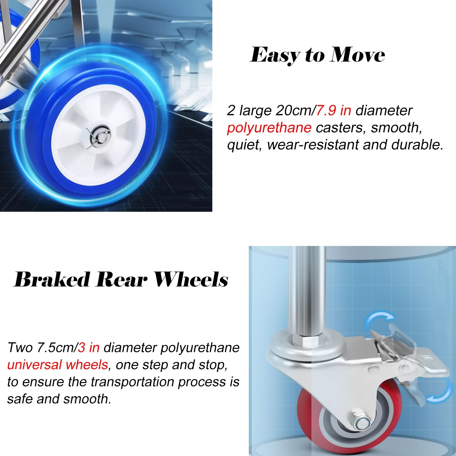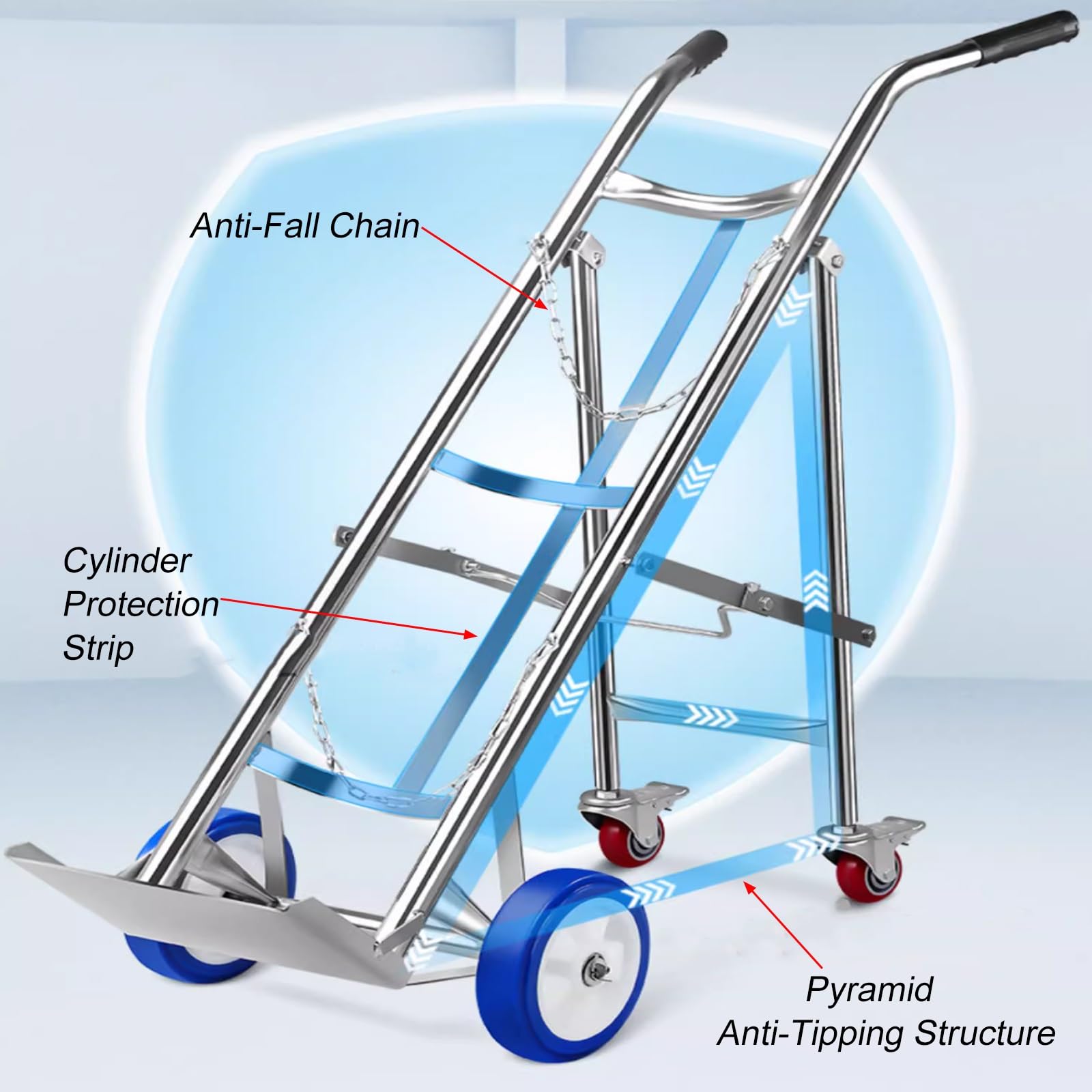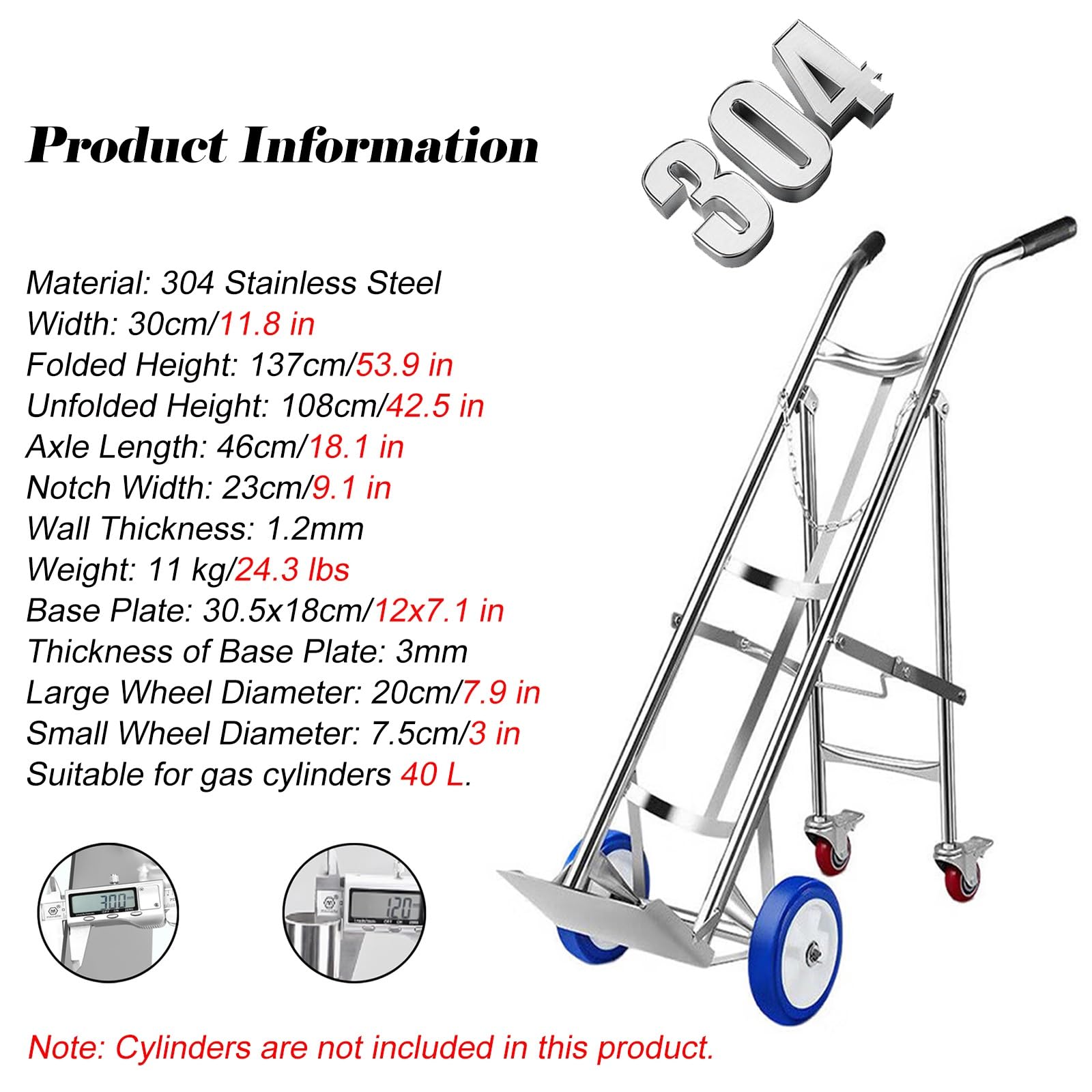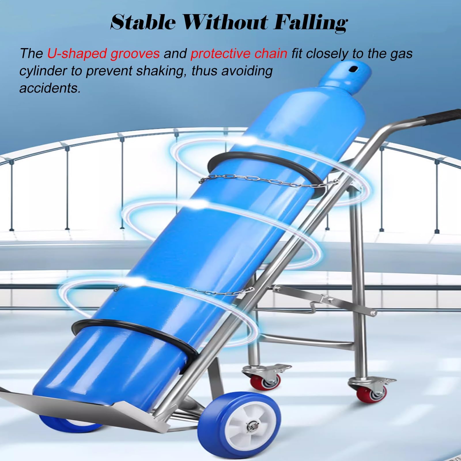 - Con ruedas: Carro de cilindros de gas con dos ruedas de poliuretano de gran tamaño de 7,9 pulgadas, resistentes al desgaste y duraderas, la parte posterior de las dos ruedas universales de 3 pulgadas con freno, una vez que se pisa el tope, para proteger la seguridad de los cilindros de gas.